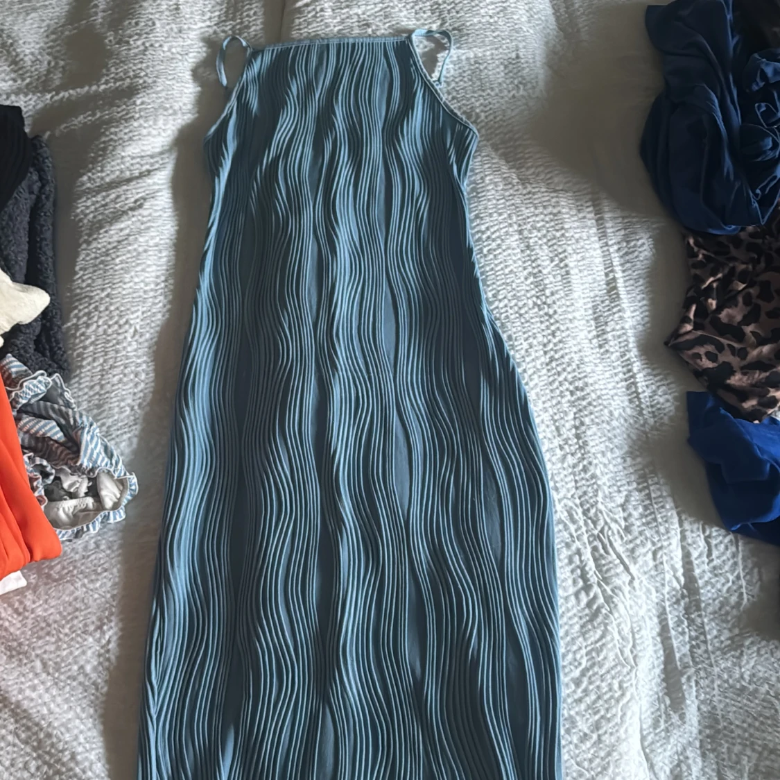 Snygg blå klänning med ribbad struktur och smala axelband. Perfekt för en stilren look. Klänningen har en lång passform som ger en elegant siluett.