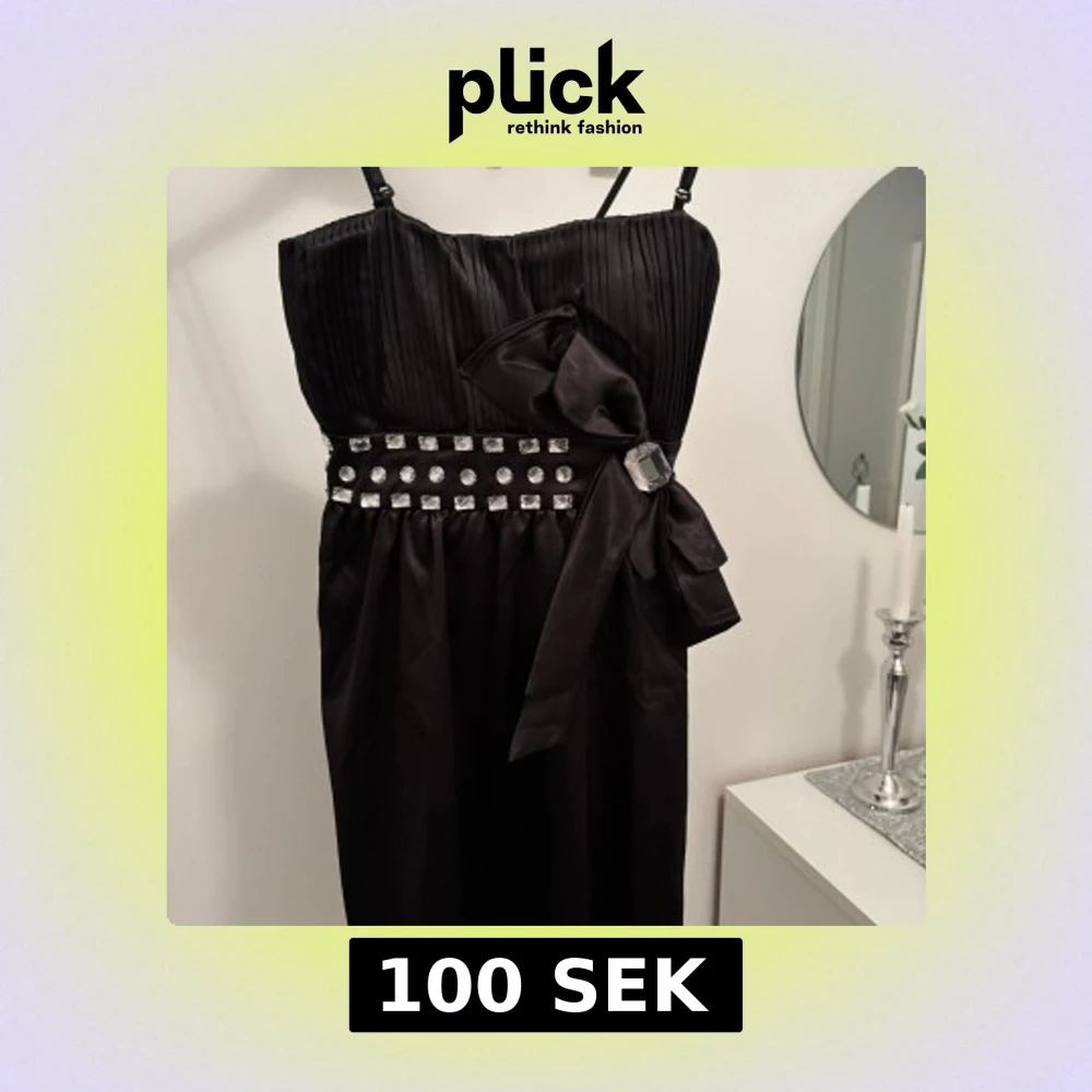 Snygg svart klänning med axelband, plisserad överdel och stor rosett i midjan. Midjan är dekorerad med glittriga stenar och en stor dekorativ sten. Perfekt för dig som vill sticka ut med en elegant look.