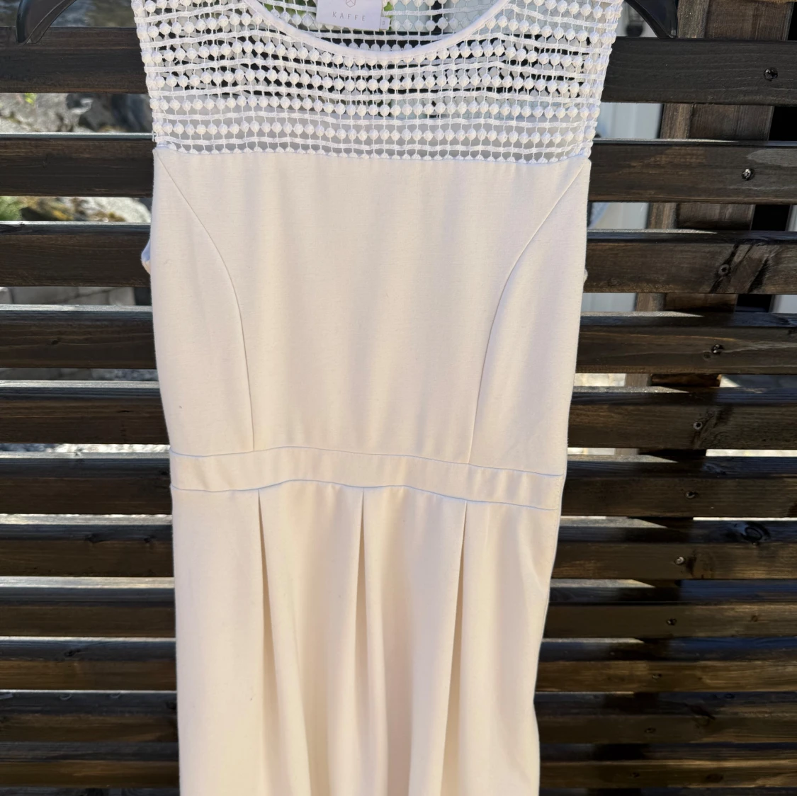 Superfin vit klänning från Kaffe med snyggt spetsmönster upptill och markerad midja. Klänningen har ärmlös design och lätt utställd kjol, perfekt för sommarens alla tillfällen. Enkel men ändå elegant look!