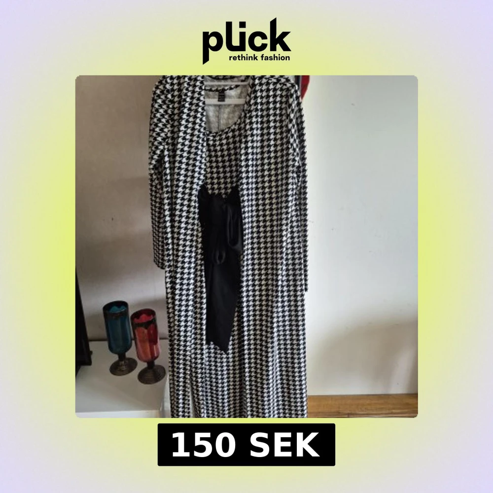 Säljer en svartvit långklänning med klassiskt hundtandsmönster. Klänningen är ärmlös och har ett svart knytband i midjan. Till klänningen hör en matchande långärmad kavaj i samma mönster. Perfekt för dig som gillar retrostil!