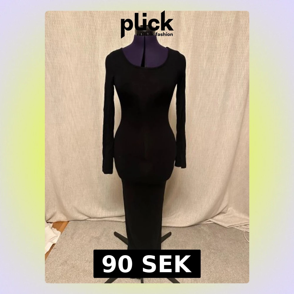 En stilren svart långklänning med lång ärm och rund halsringning. Klänningen är figurnära och har en minimalistisk design utan mönster eller detaljer. Materialet är stretchigt och mjukt, vilket ger en snygg och smickrande passform.