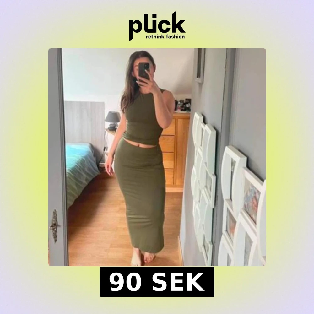 Säljer en olivgrön ärmlös långkjol med topp, tight passform och rund halsringning i storlek S från shein. Klänningen har en enkel och stilren design som framhäver figuren. Perfekt för dig som gillar minimalistisk stil.