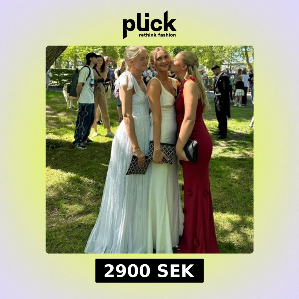 Säljer en vacker vit klänning med spetsdetaljer och knytband på axlarna. Klänningen har en v-ringad design och är perfekt för bal etc!
