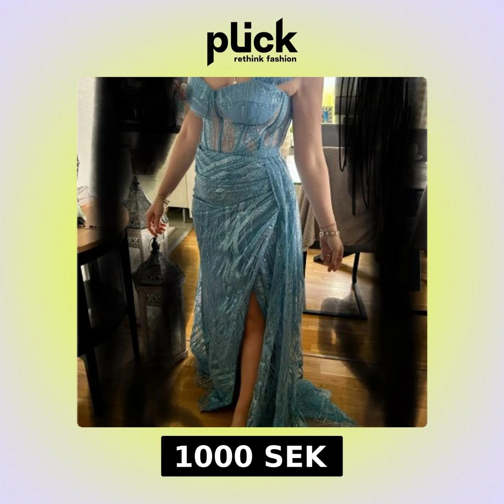 Säljer en ljusblå långklänning med glittrigt mönster och markerad midja. Klänningen har smala axelband, transparenta partier upptill och en hög slits framtill. Perfekt för bal eller fest! 💙
