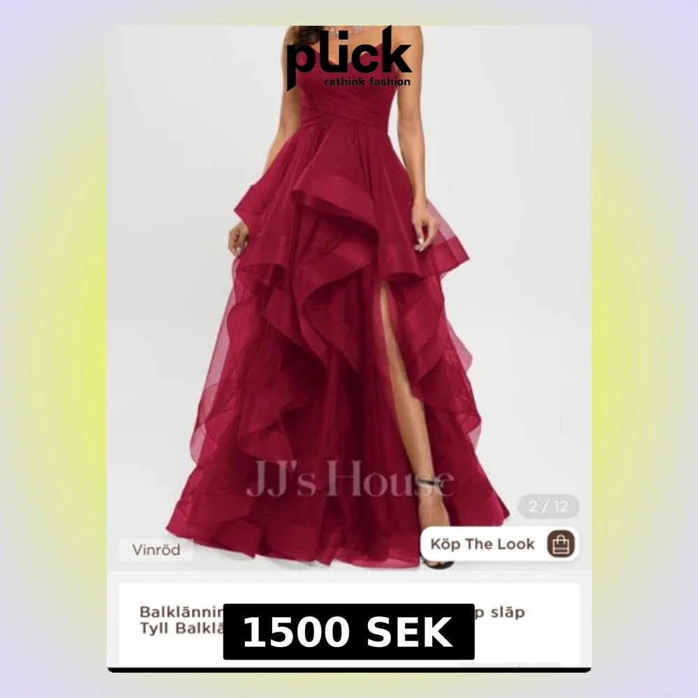 Säljer en vinröd balklänning från JJ's House med v-ringning, tunna axelband och dramatiska volanger i flera lager. Klänningen har en hög slits och är tillverkad i luftig tyll som ger en riktigt elegant känsla.