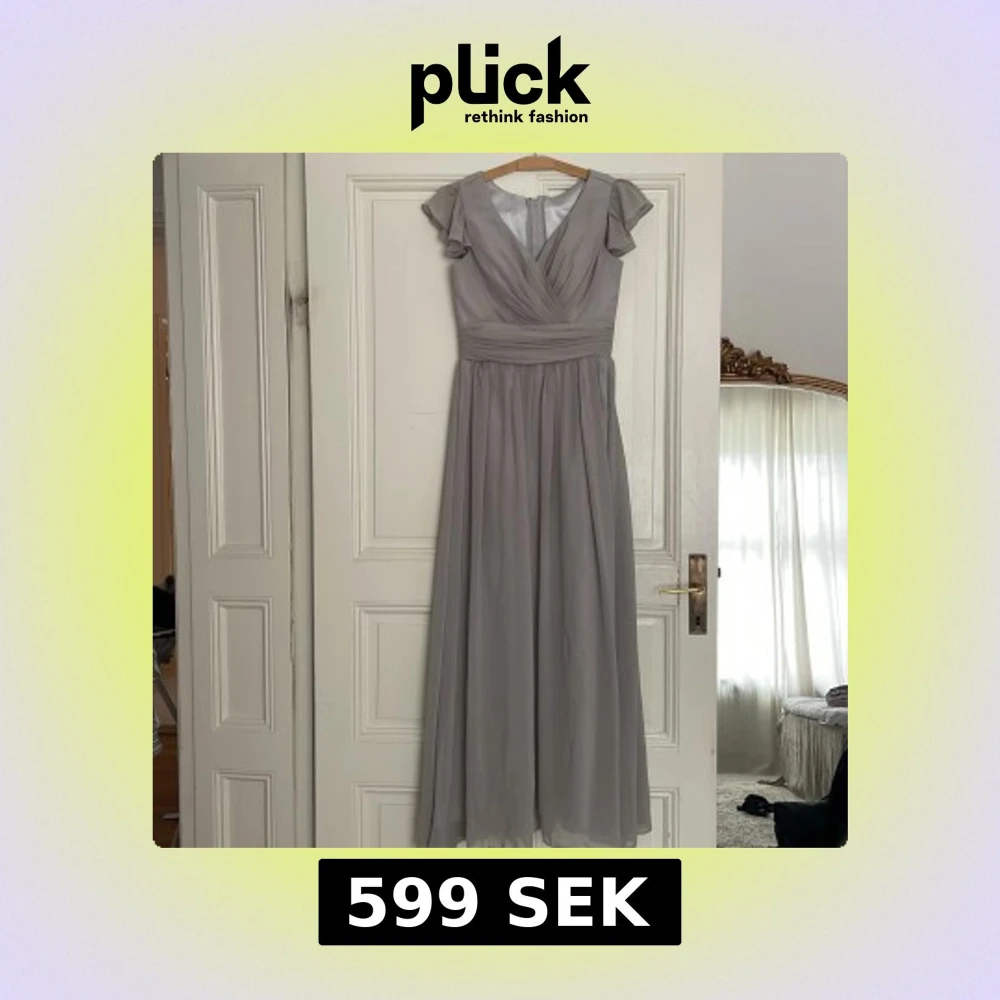 Elegant grå långklänning med v-ringad omlott-design och volangärmar. Klänningen har en dragkedja i ryggen och ett brett band i midjan som ger en smickrande passform. Perfekt för speciella tillfällen. Perfekt för bal eller brudtärna