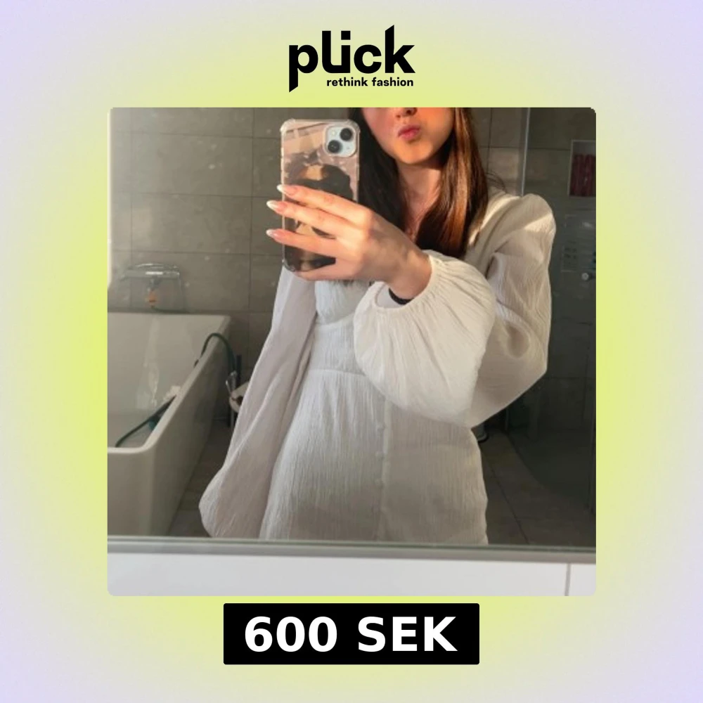Superfin vit klänning med puffiga långärmar och knappar framtill. Klänningen har en lätt strukturerad yta och markerad midja som ger en snygg siluett. Perfekt för studenten