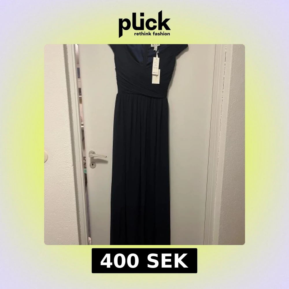 Elegant mörkblå långklänning från NLY Eve med v-ringning och kortärmad design. Klänningen har en smickrande omlott-look upptill och en dragkedja i ryggen. Perfekt för speciella tillfällen.