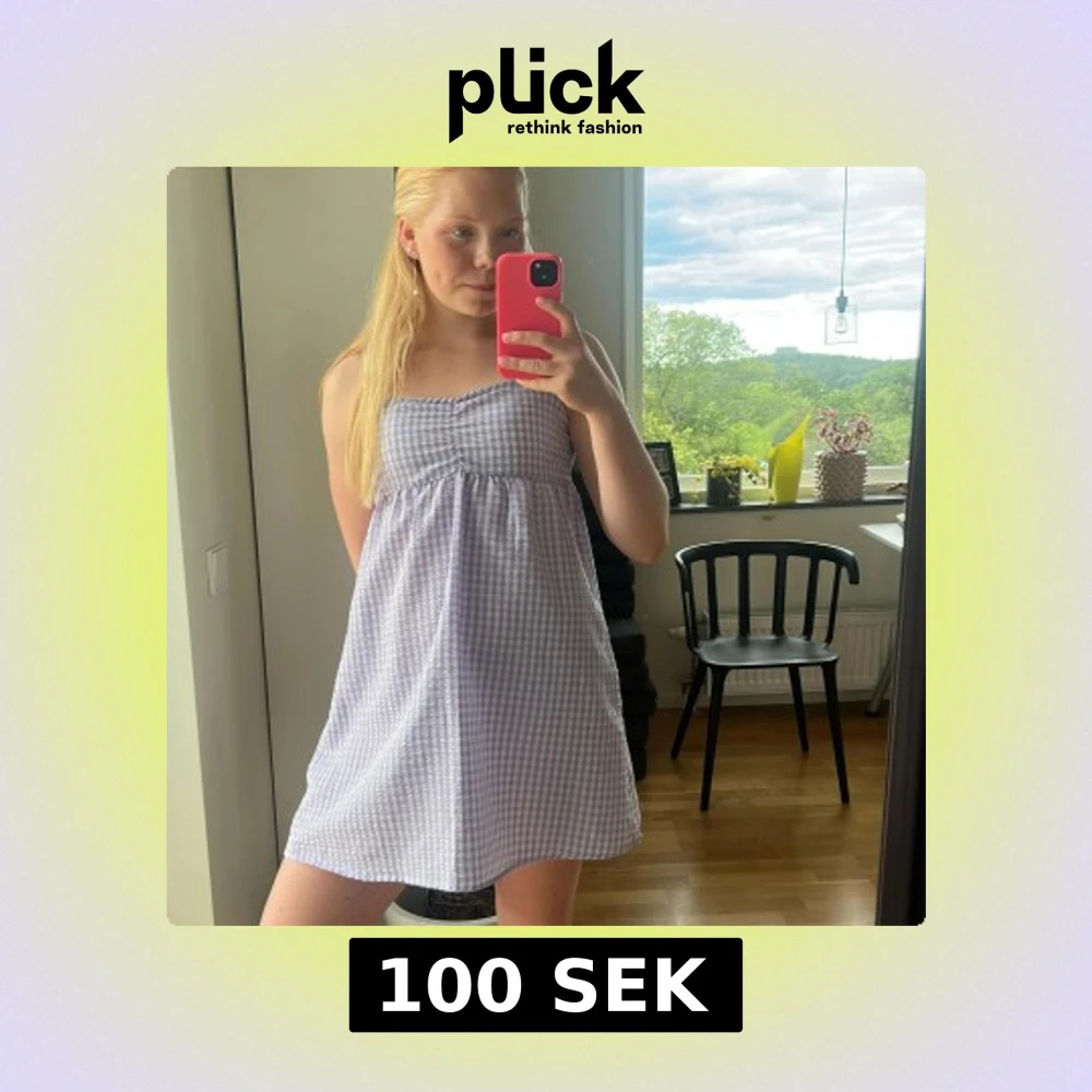 Supersöt kortklänning i ljuslila och vitt med rutigt mönster. Klänningen har tunna axelband med spetsdetalj och en luftig, A-linjeformad passform. Perfekt för varma dagar och ger en fräsch och ungdomlig vibe.