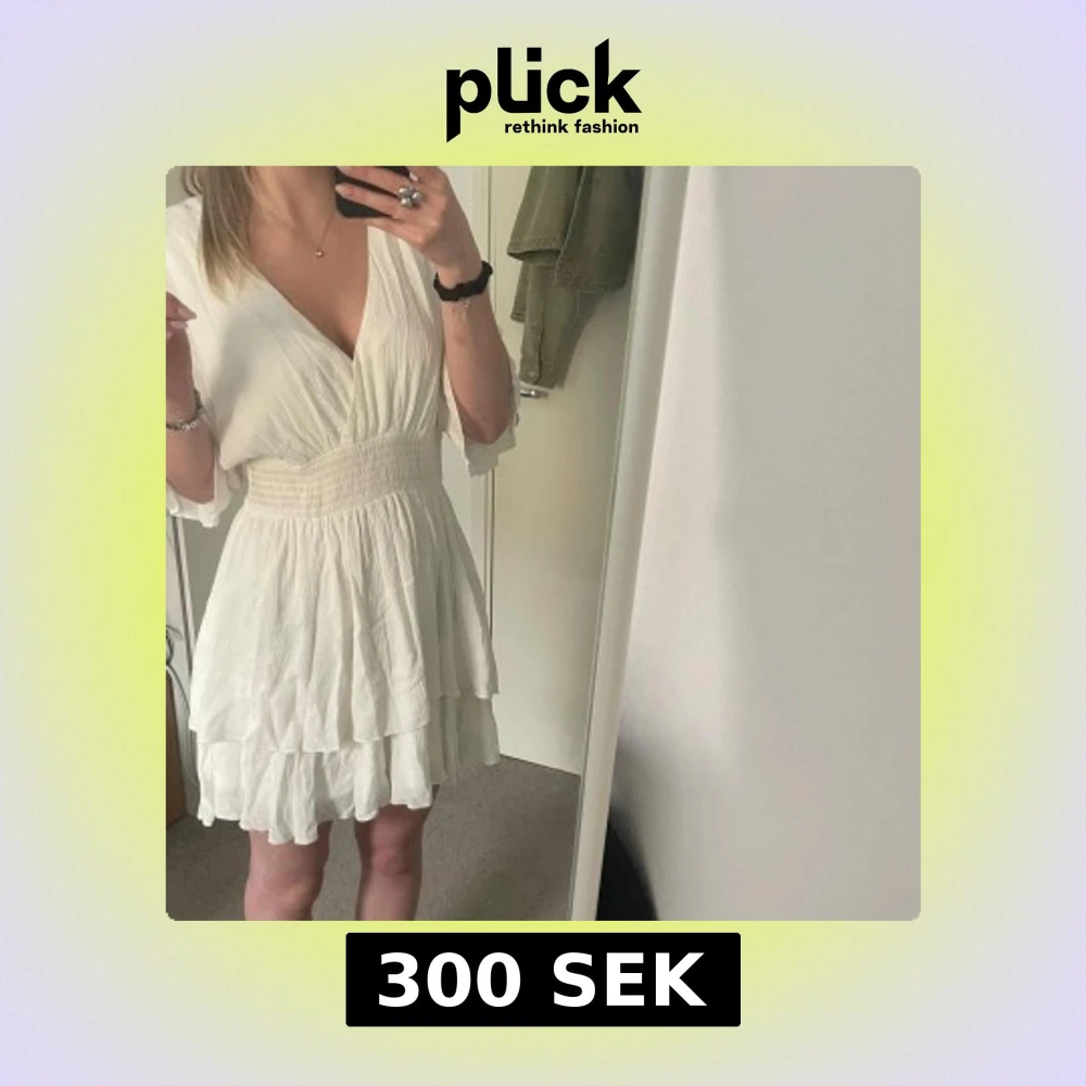 Supersöt vit kortklänning med omlott och v-ringning. Klänningen har bred smock i midjan, volangig kjol och luftiga korta ärmar. Perfekt för sommarens alla tillfällen och ger en fräsch och luftig känsla.