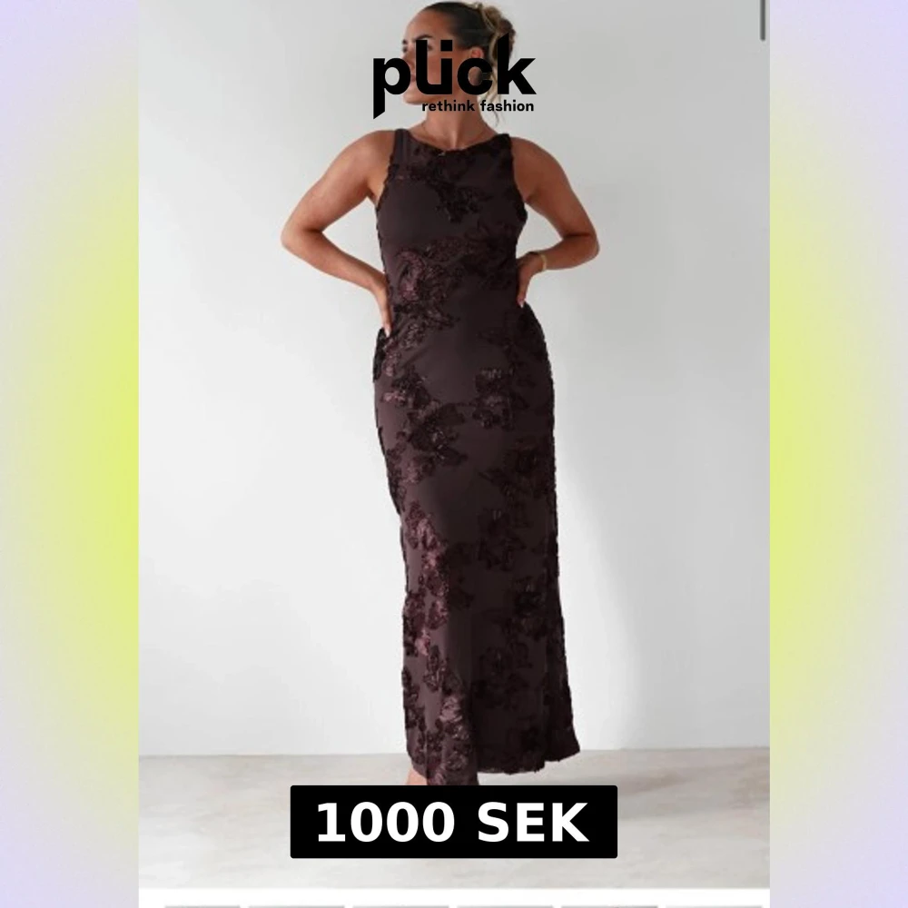 Supersnygg mörkbrun långklänning från Oh Hello Clothing med blommigt mönster och öppen rygg. Klänningen är ärmlös och har tunna axelband samt en figurnära passform. Materialet känns lyxigt och har broderade detaljer som ger en extra touch.