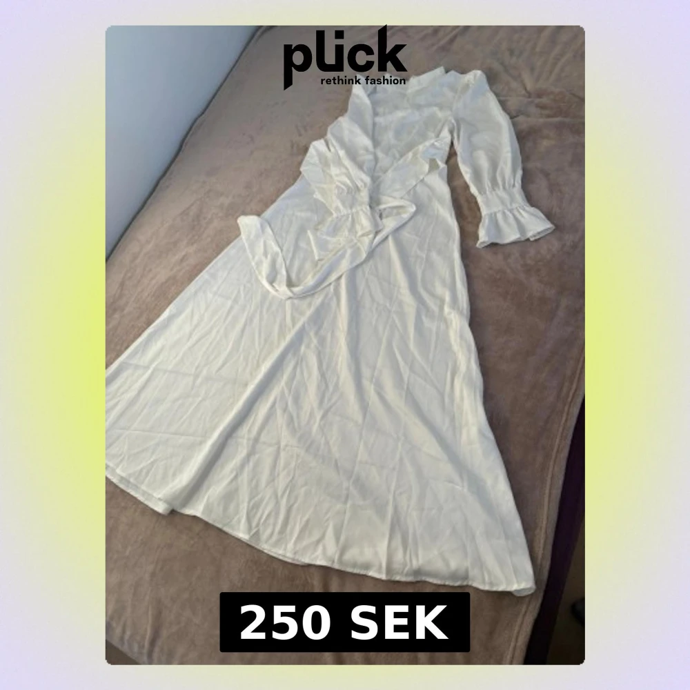 Elegant vit långklänning i satinliknande material med markerad midja och knytband. Klänningen har långa ärmar med volangdetaljer och silvriga knappar vid ärmsluten. Rundad halsringning och diskret dragkedja bak för enkel påklädning.