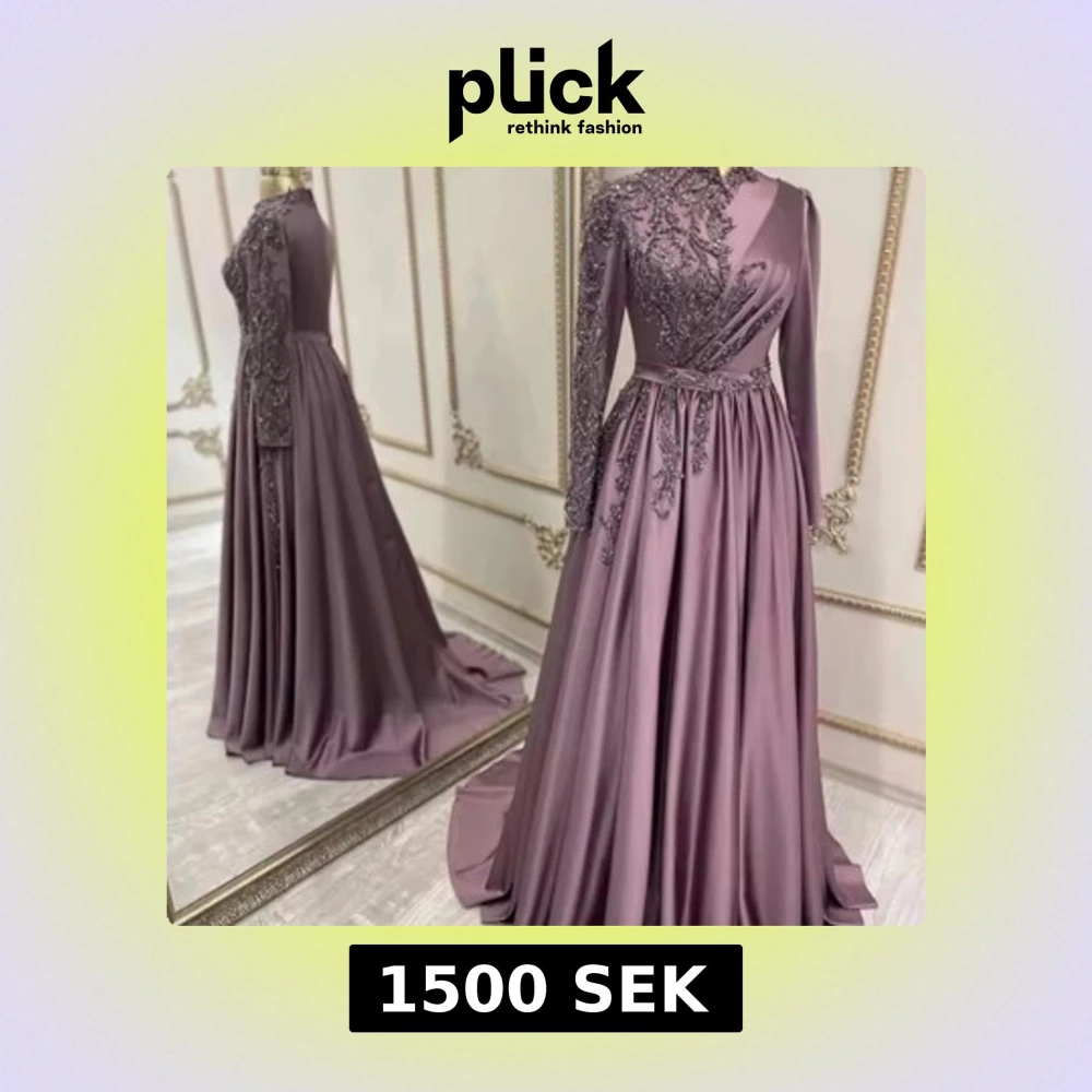 Elegant lila långklänning med långärmad design och vackra spetsdetaljer på överdelen. Klänningen har omlott-effekt och ett svepande, utsvängt kjolparti som ger en lyxig känsla. Perfekt för speciella tillfällen och bal.