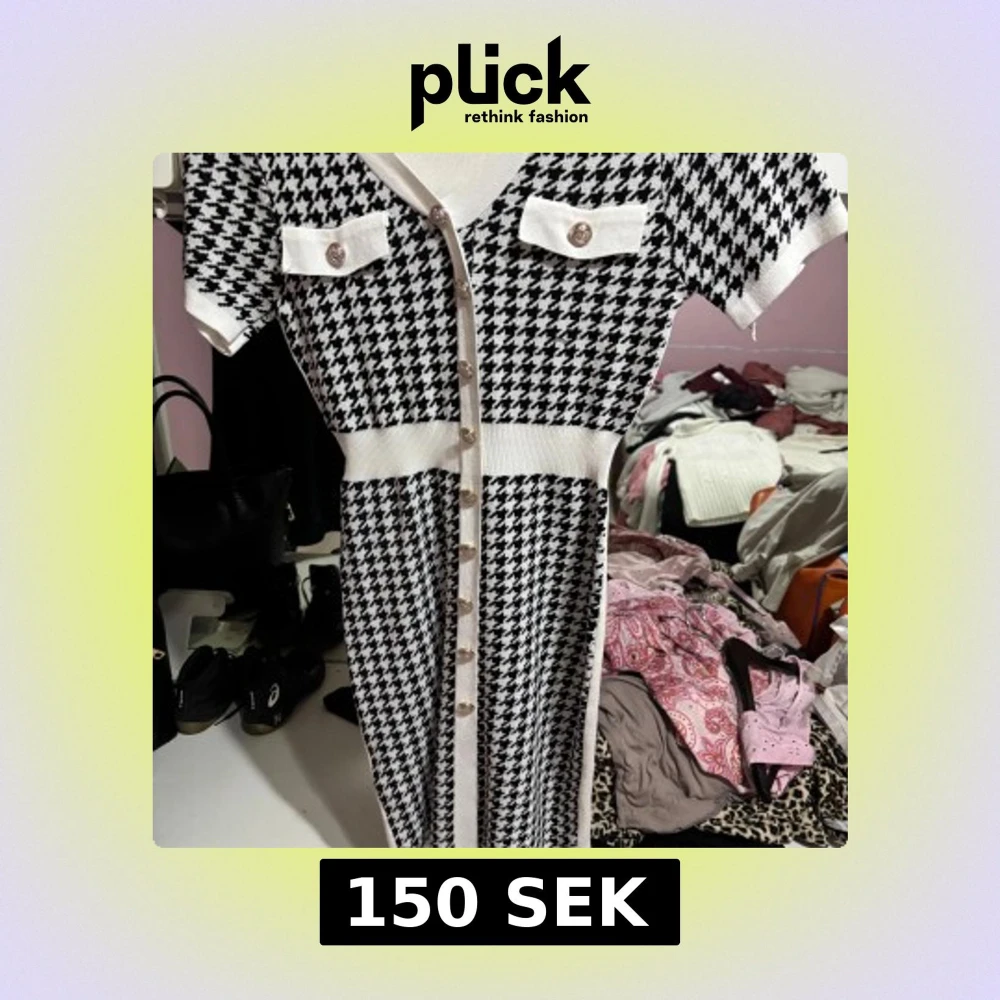 Snygg svartvit klänning med hundtandsmönster och korta ärmar. Klänningen har en v-ringad design med dekorativa knappar framtill och två fickdetaljer på bröstet. Perfekt för en chic look!
