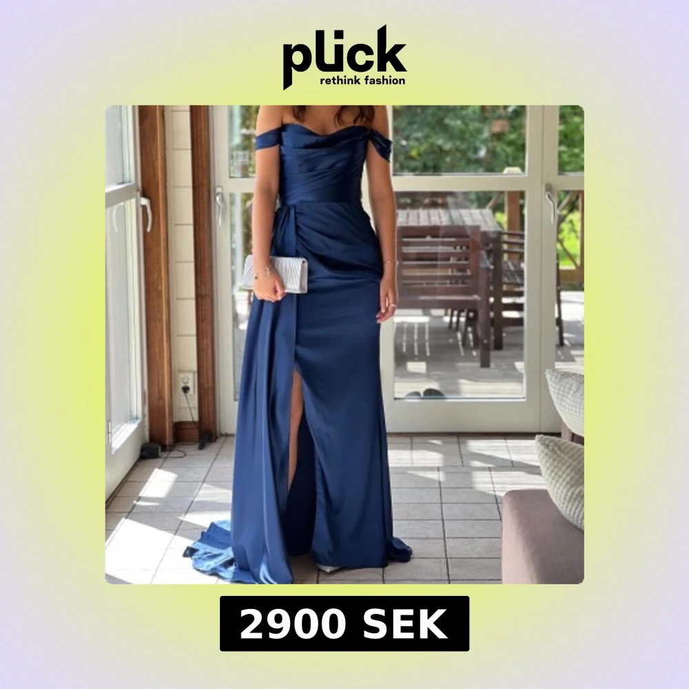 Elegant marinblå långklänning från Dressroom Linné med offshoulder-design och en vacker slits framtill. Klänningen har en draperad detalj i midjan och ett släp som sitter fast vid sidan av midjan. Perfekt för speciella tillfällen.