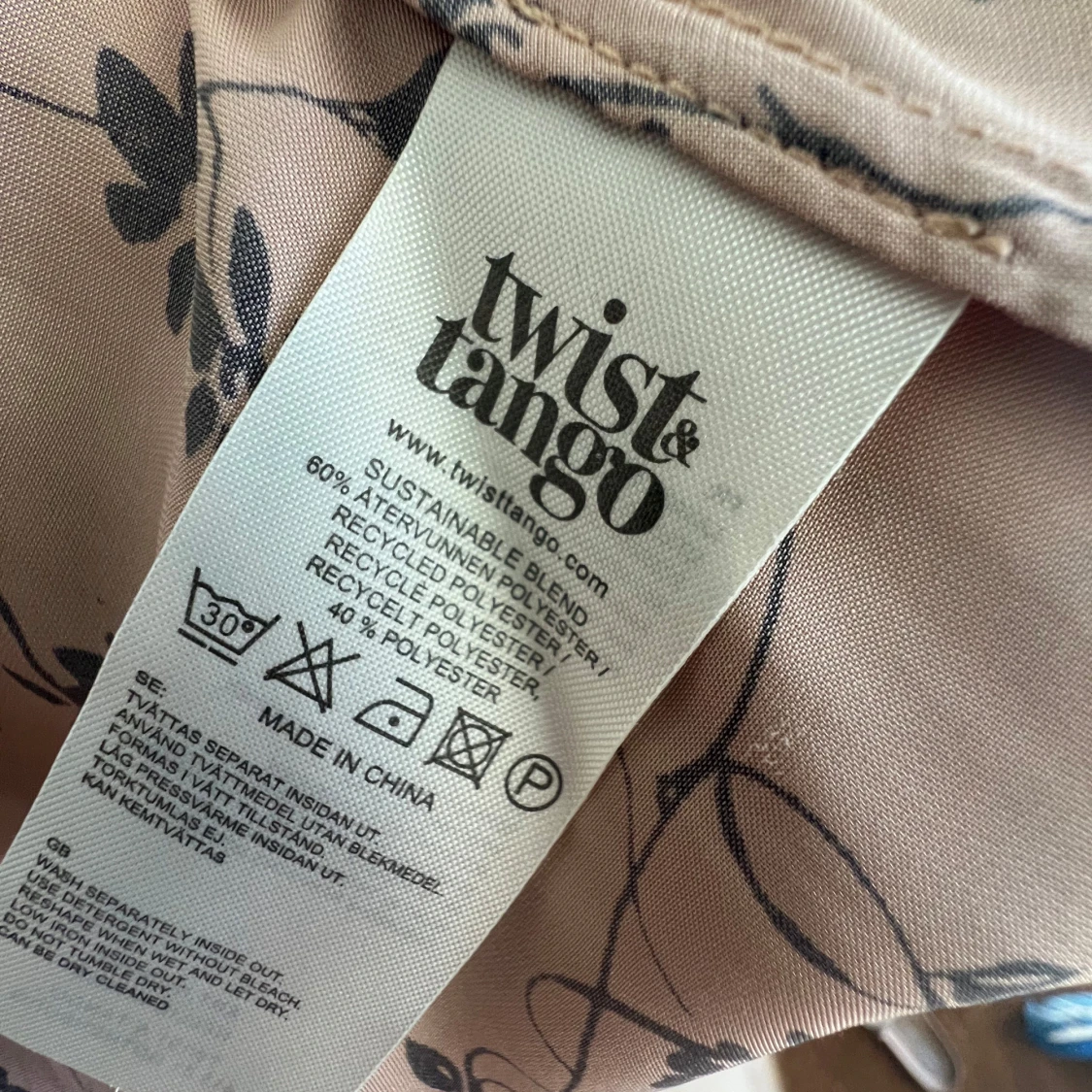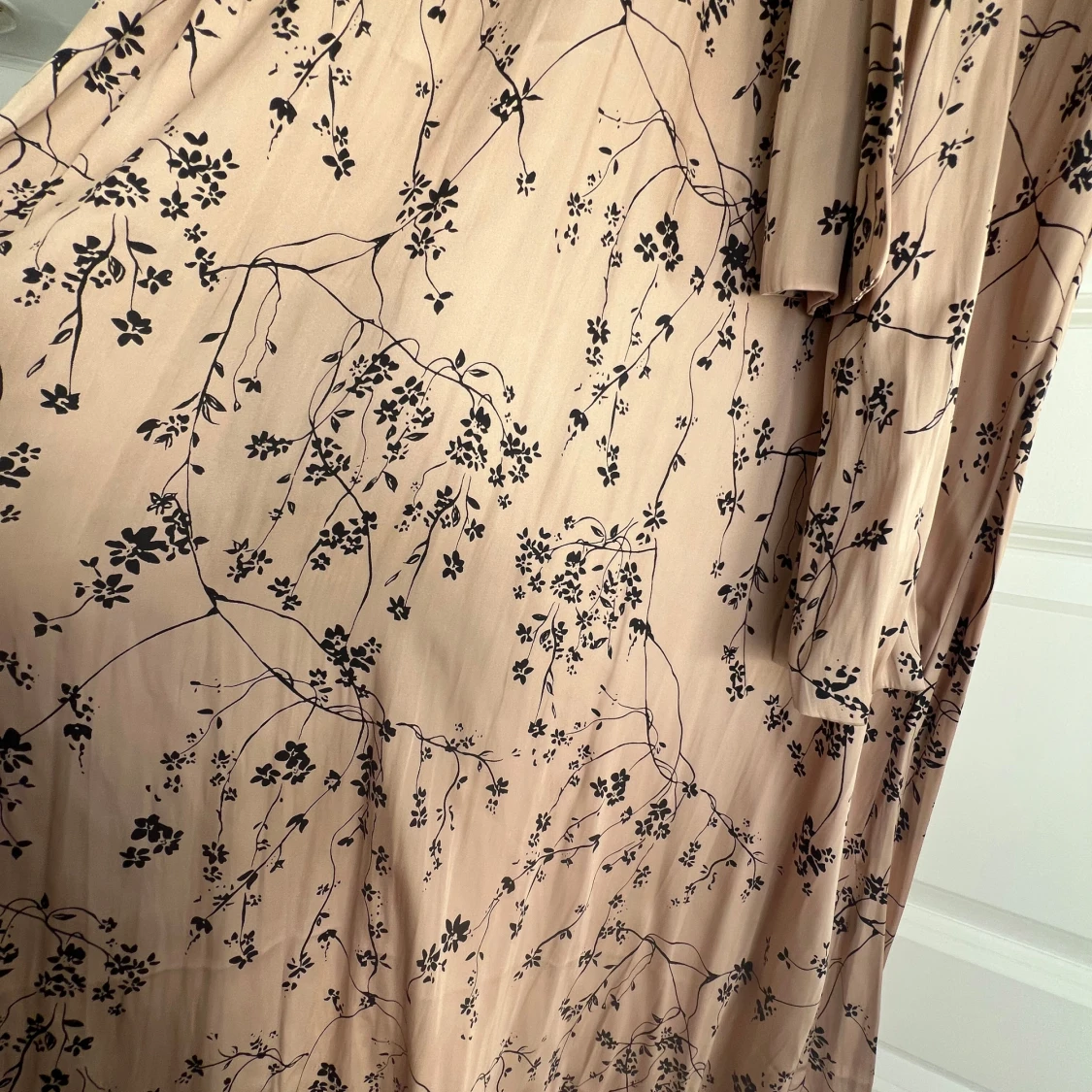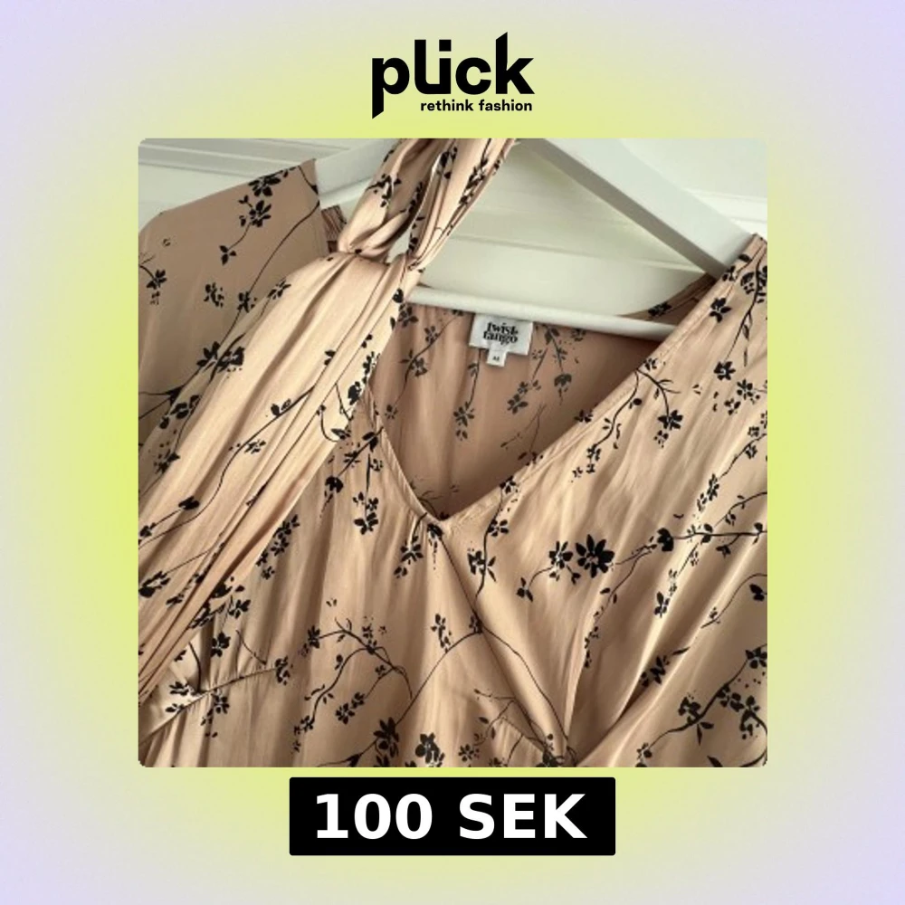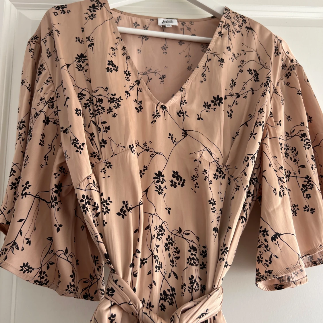 Superfin beige klänning från Twist & Tango med svart blommigt mönster, v-ringning och knytband i midjan. Klänningen har vida trekvartsärmar och är tillverkad i återvunnen polyester. Perfekt för en somrig och avslappnad look.