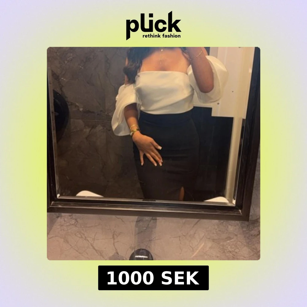 Säljer en elegant långklänning i svart och vitt med offshoulder och puffiga ärmar. Klänningen har en figurnära passform och en hög slits framtill som ger en snygg touch. Perfekt för dig som vill sticka ut med stilrena detaljer och trendig design.