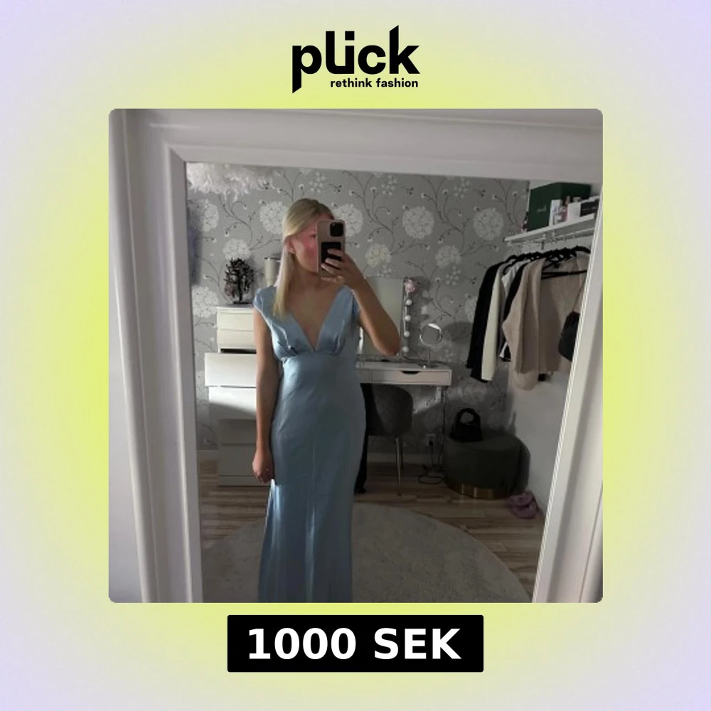 Säljer en ljusblå långklänning med djup v-ringning och öppen rygg. Klänningen har en figurnära passform. Perfekt för t.ex balen. Säljes för att den ej var rätt för mig. Aldrig andvänd