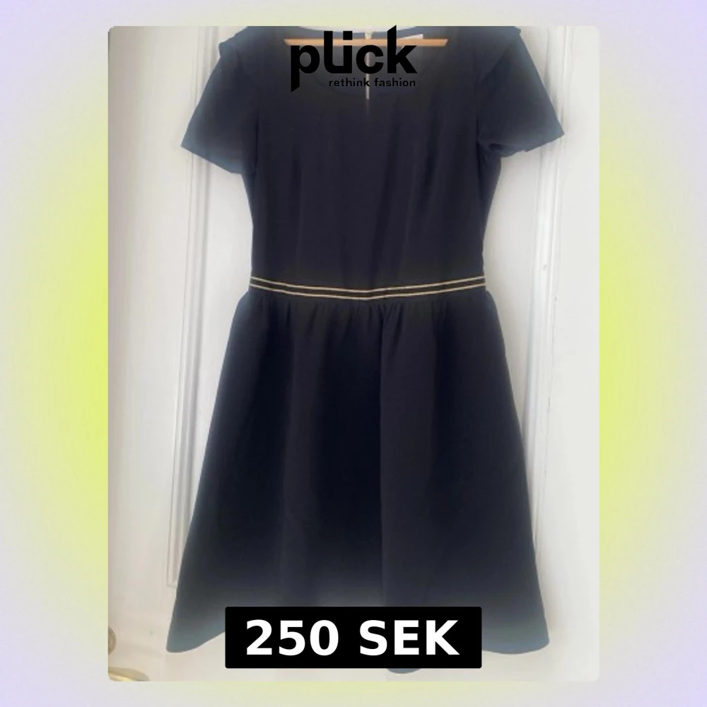 En svart klänning med rund halsringning och korta ärmar. Midjan markeras av ett tunt guldfärgat band som ger en snygg kontrast. Kjolen har en lätt utställd form och klänningen slutar strax under knät. Perfekt för dig som gillar enkel men elegant stil.