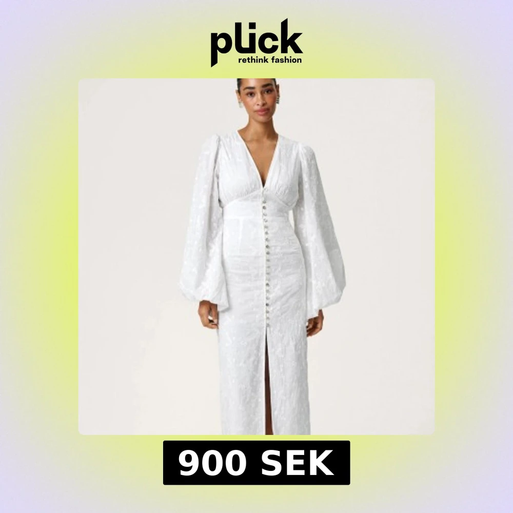 Adoore positano dress. Superfin vit långklänning med djup v-ringning, puffiga långärmar och knappar framtill. Klänningen har broderade blommor i tyget och markerad midja. Perfekt för sommarens speciella tillfällen! Nypris 1695kr