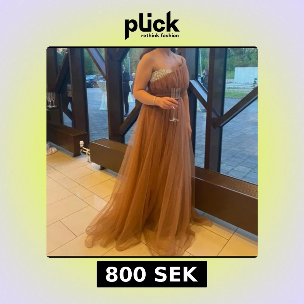 Elegant brun axelbandslös balklänning med glittriga detaljer på bysten. Klänningen har en lång, flödande kjol i ett lätt och luftigt material som ger en drömlik känsla. Perfekt för en speciell kväll!
