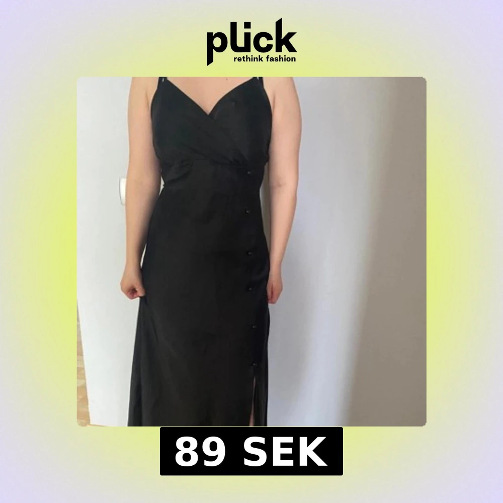 Elegant svart långklänning med knappar längs sidan och en subtil slits. Klänningen har smala axelband och en omlott-design framtill. Perfekt för en stilren look.