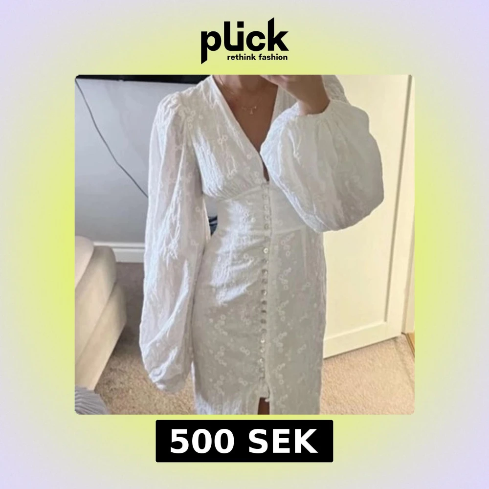 Elegant vit klänning med långa puffärmar och v-ringning. Klänningen har fina knappar framtill och ett subtilt blommönster. Perfekt för sommarens festligheter.