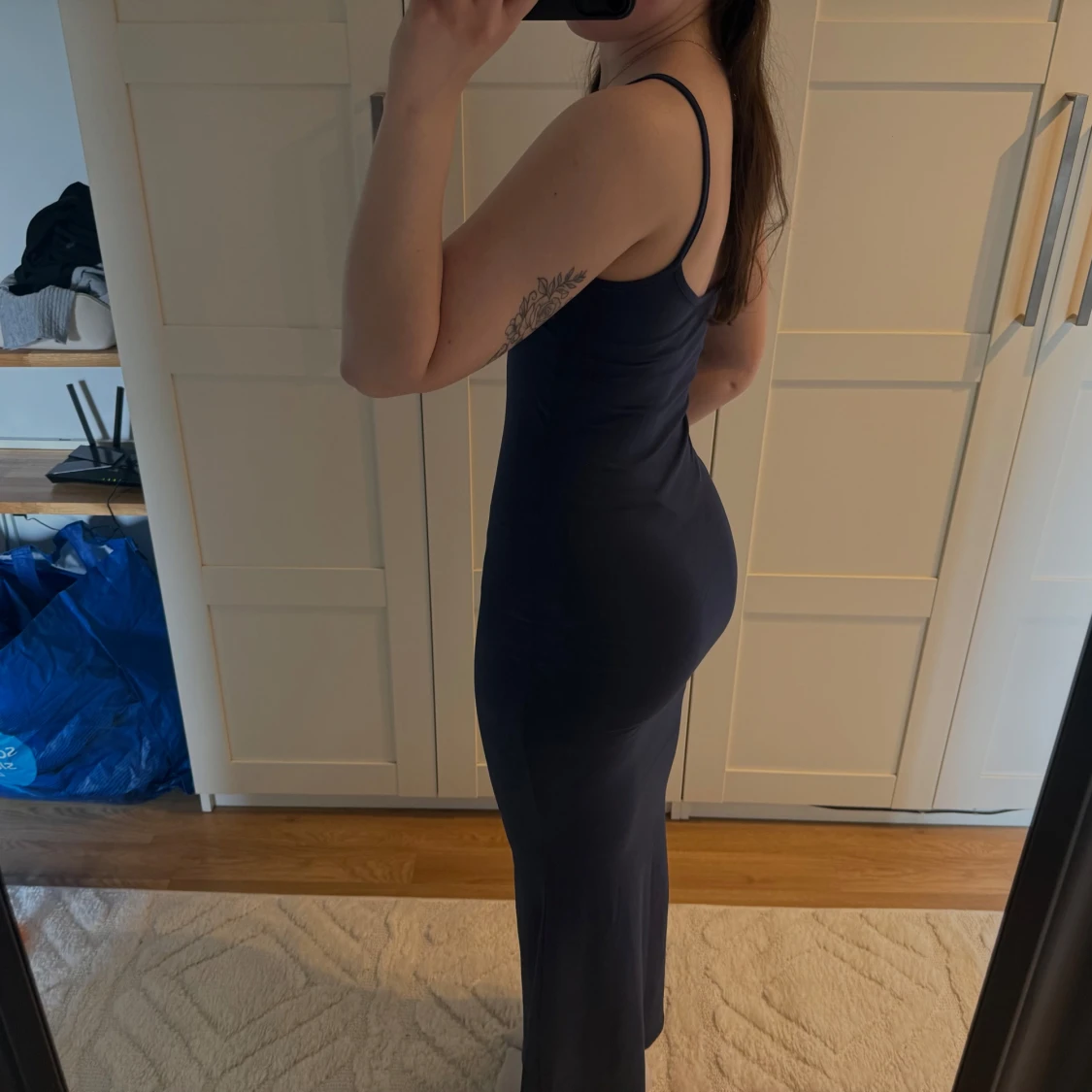 Säljer en marinblå långklänning med smala axelband och figurnära passform. Klänningen har en enkel och stilren design med rundad urringning och ärmlös modell. Perfekt för dig som gillar minimalistisk och elegant stil.