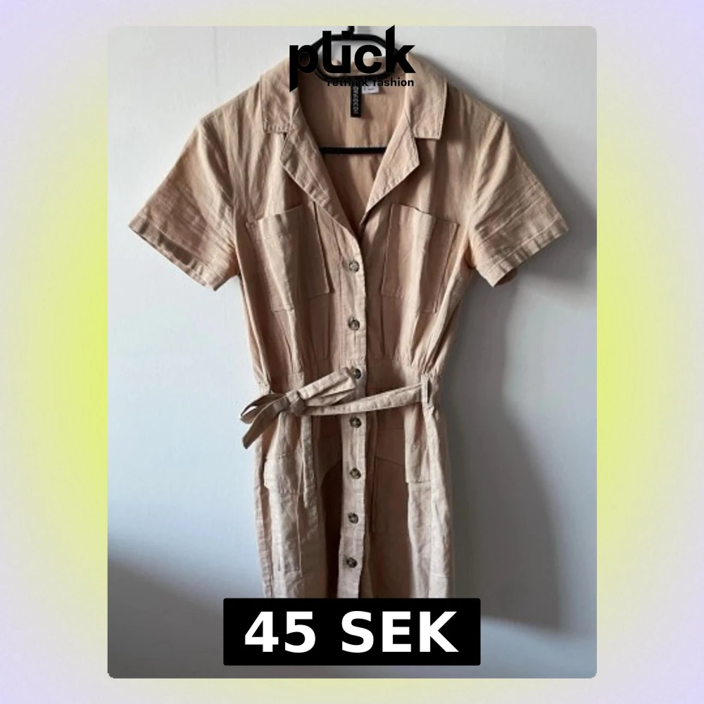 Kort skjortklänning från H&M Divided i beige med knappar framtill, två bröstfickor och två fickor längre ner även tillhörande bälte i midjan. Klänningen har korta ärmar och är tillverkad i ett lätt, vävt material