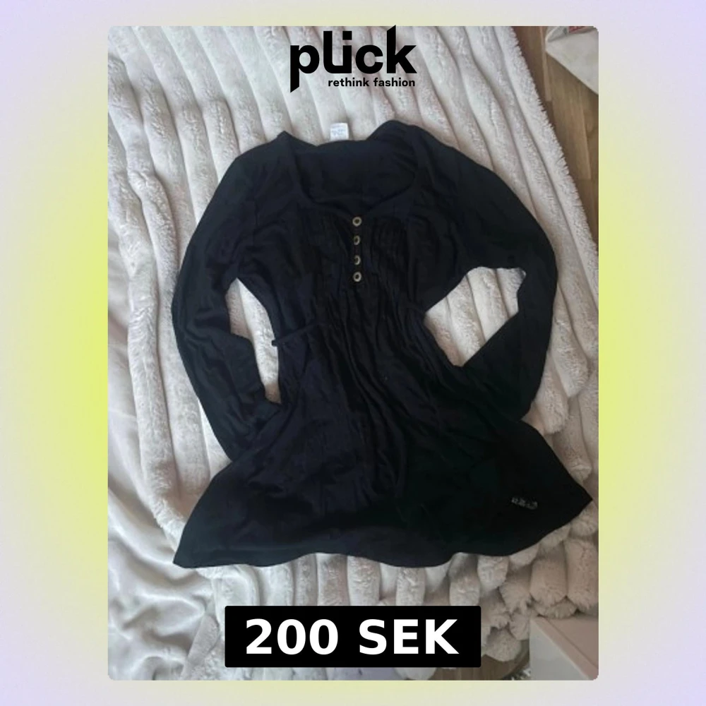 Svart långärmad blus med v-ringning och dekorativa knappar framtill. Modellen har en lös passform och lätt utställd nederdel. Perfekt för dig som gillar en enkel men ändå snygg stil. Det finns även band som man kan tajta den med som sitter på blusen,