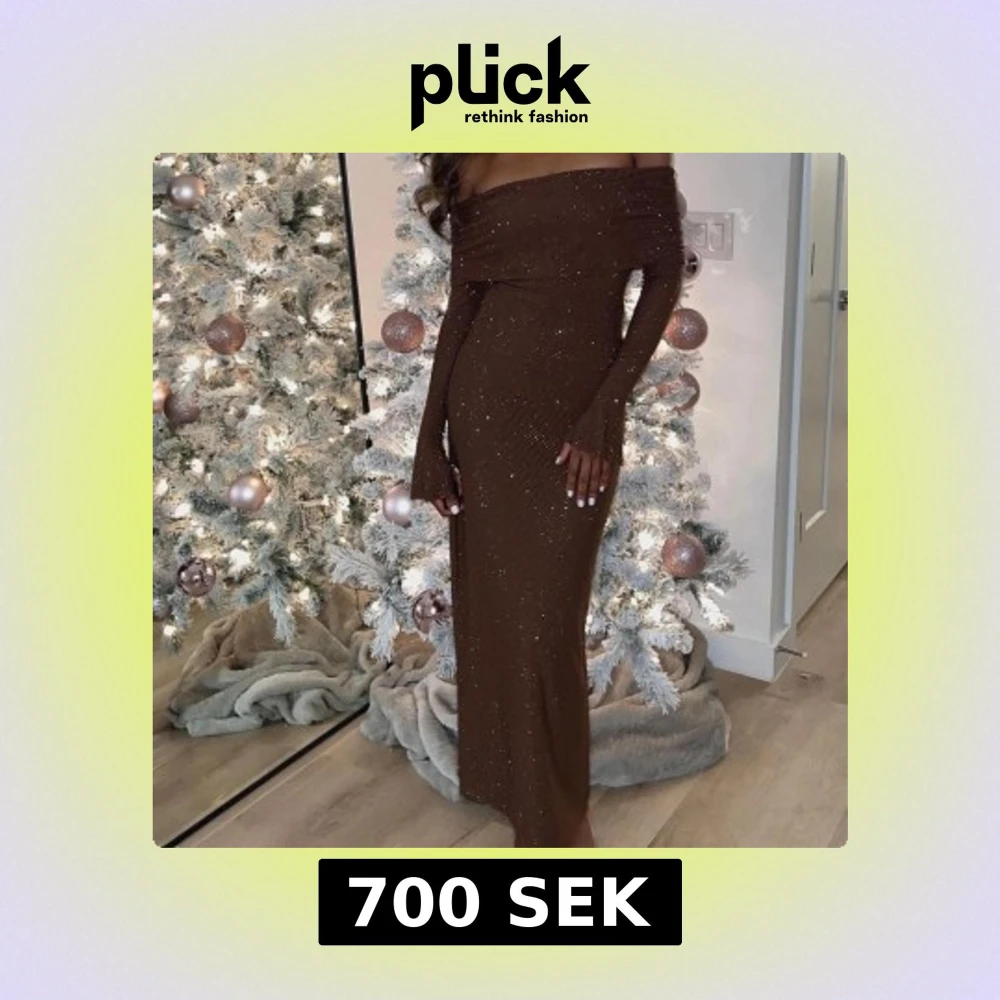 Snygg brun offshoulder klänning med glittriga detaljer. Klänningen har långa ärmar och en elegant lång design, perfekt för festliga tillfällen. Materialet är inte strechigt.