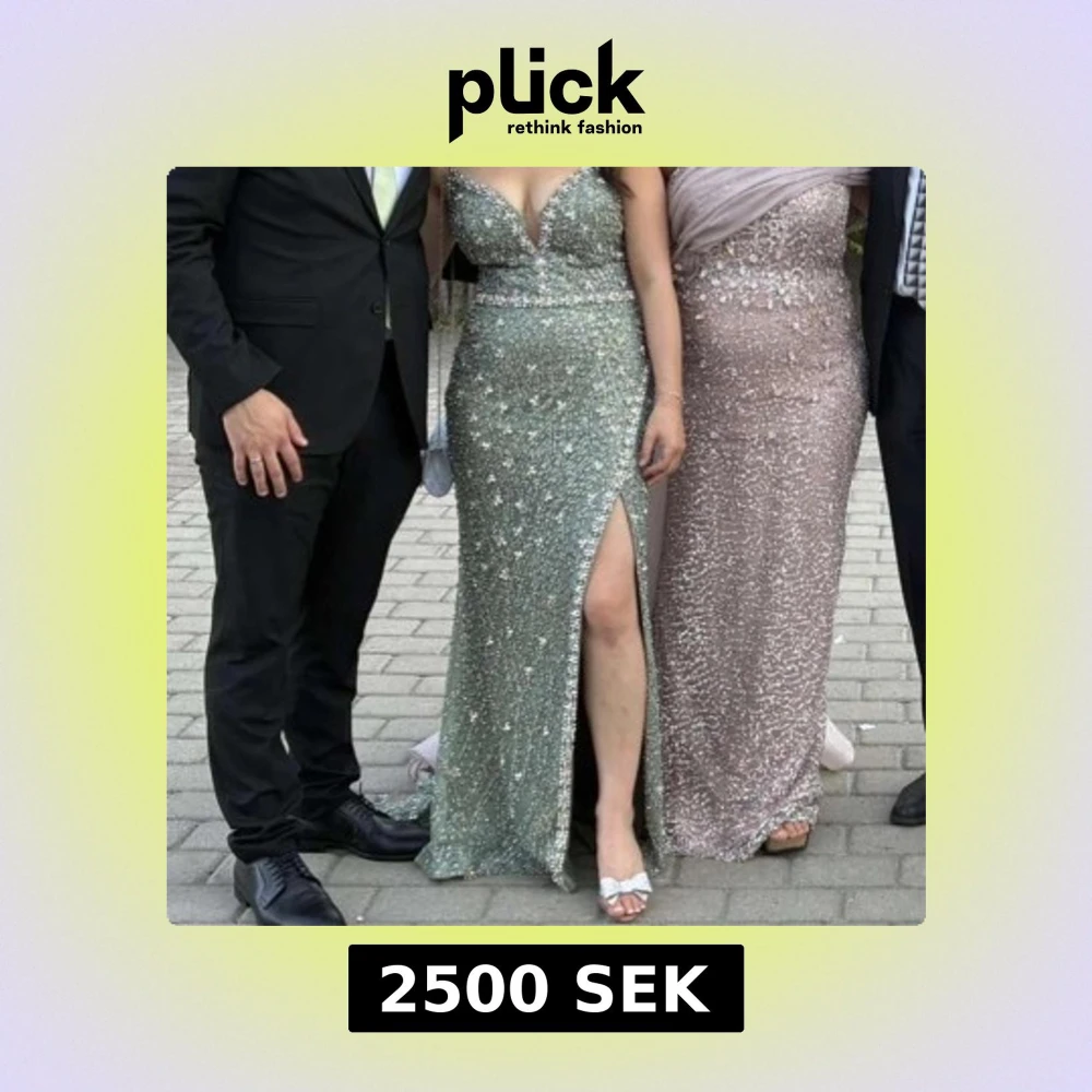 Säljer en superfin långklänning i glittrande grönt med massor av paljetter och pärldetaljer. Klänningen har en hög slits framtill som ger en snygg och elegant look. Perfekt för bal eller festliga tillfällen när du vill sticka ut. Klänningen är insydd i midjan och längs vid läppen för att den inte ska gå sönder och då en mer elegant look