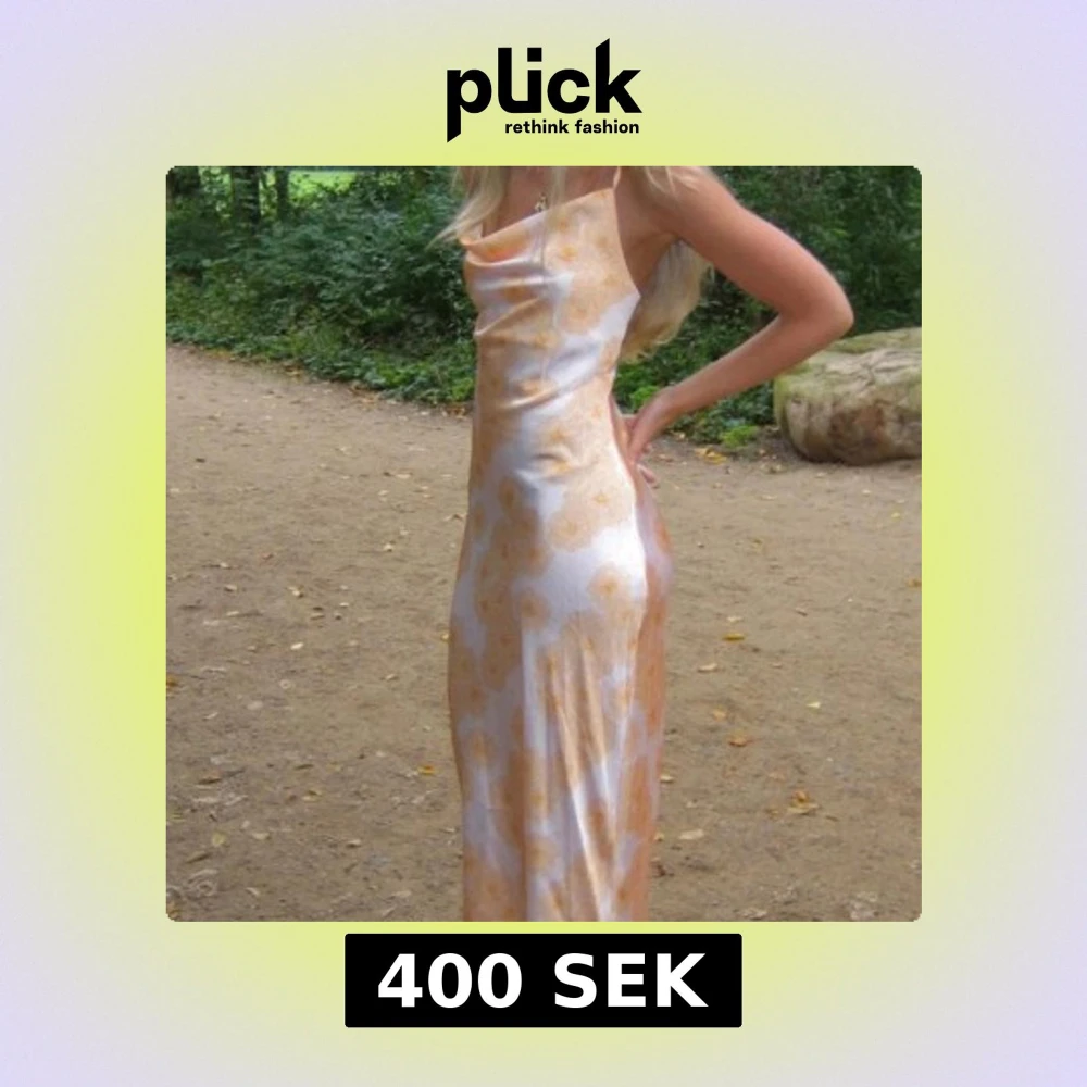 Superfin långklänning med ljusgult blommönster på vit botten. Klänningen har smala axelband, öppen rygg med snygg snörning och en figurnära passform. Materialet är glansigt och känns lyxigt, perfekt för sommarkvällar eller när du vill känna dig extra fin.