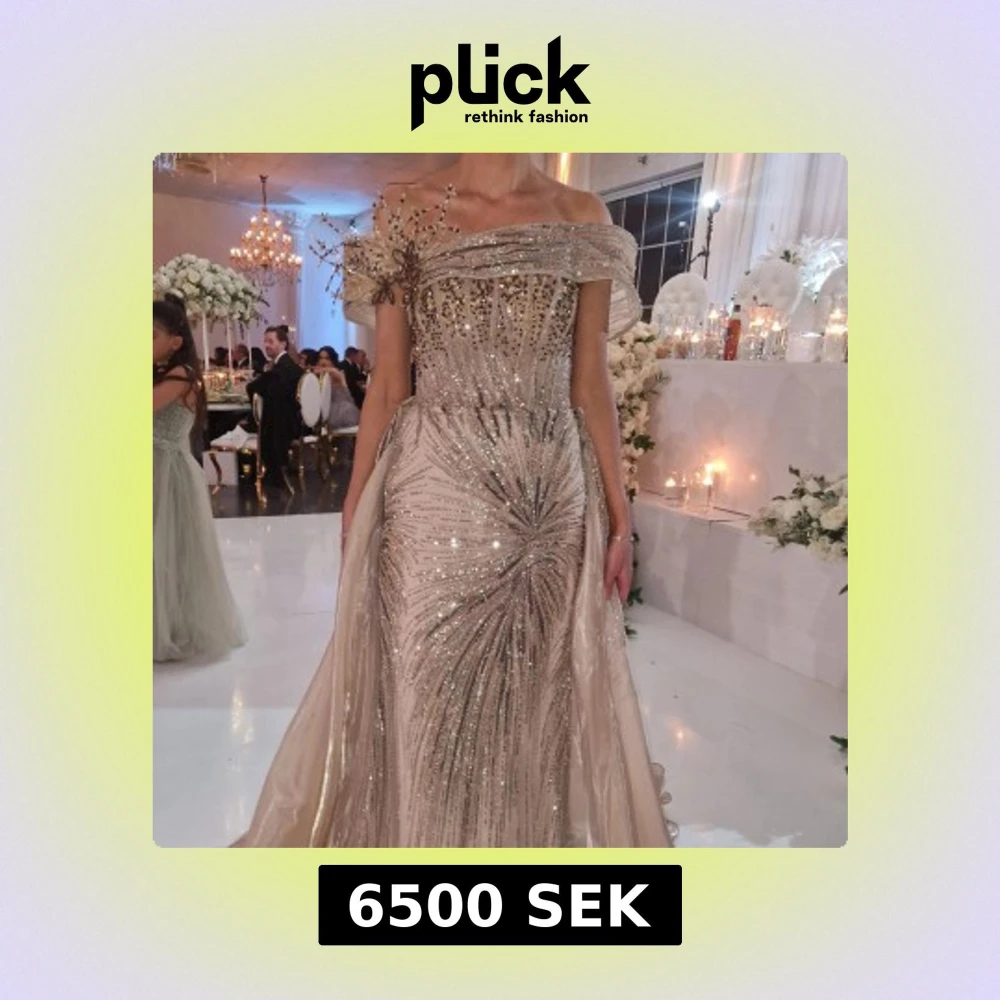 Säljer en fantastisk guldig långklänning med glittriga paljetter och offshoulder-modell. Klänningen har en vacker omlott-detalj upptill och ett elegant släp. Perfekt för bal eller fest där du vill glänsa extra mycket. PRIS KAN DISKUTERAS💕