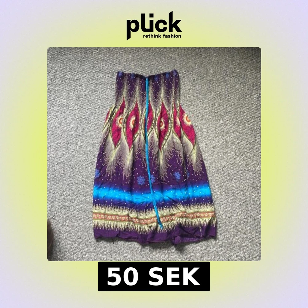 Säljer en superfin kortklänning med färgstarkt påfågelfjädermönster i lila, blått, gult och rött. Klänningen har bandeau-modell utan axelband och en smockad överdel med knytband. Perfekt för sommarens varma dagar! 50kr plus frakt.