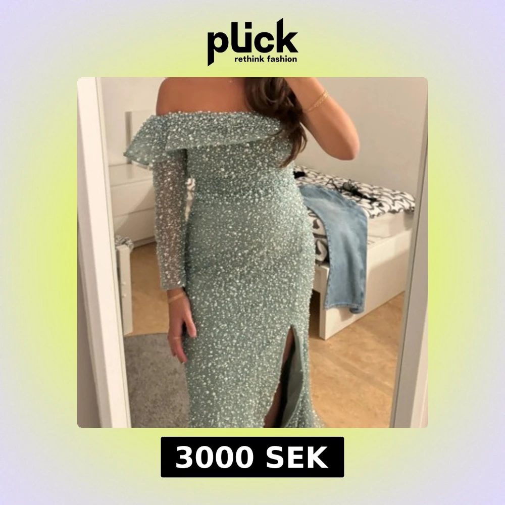 Säljer en ljusblå långklänning med glittriga pärlor över hela tyget. Klänningen har offshoulder-design, transparenta långärmar och en snygg slits framtill. Passformen är slim och tyget känns lyxigt och festligt. Perfekt för bal eller bröllop!