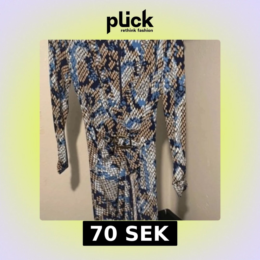 Snygg långklänning med coolt mönster i blått, beige och svart. Klänningen har lång ärm och ett matchande bälte i midjan som ger en schysst siluett. Perfekt för dig som gillar att sticka ut med unika prints och vill ha en bekväm men trendig look.
