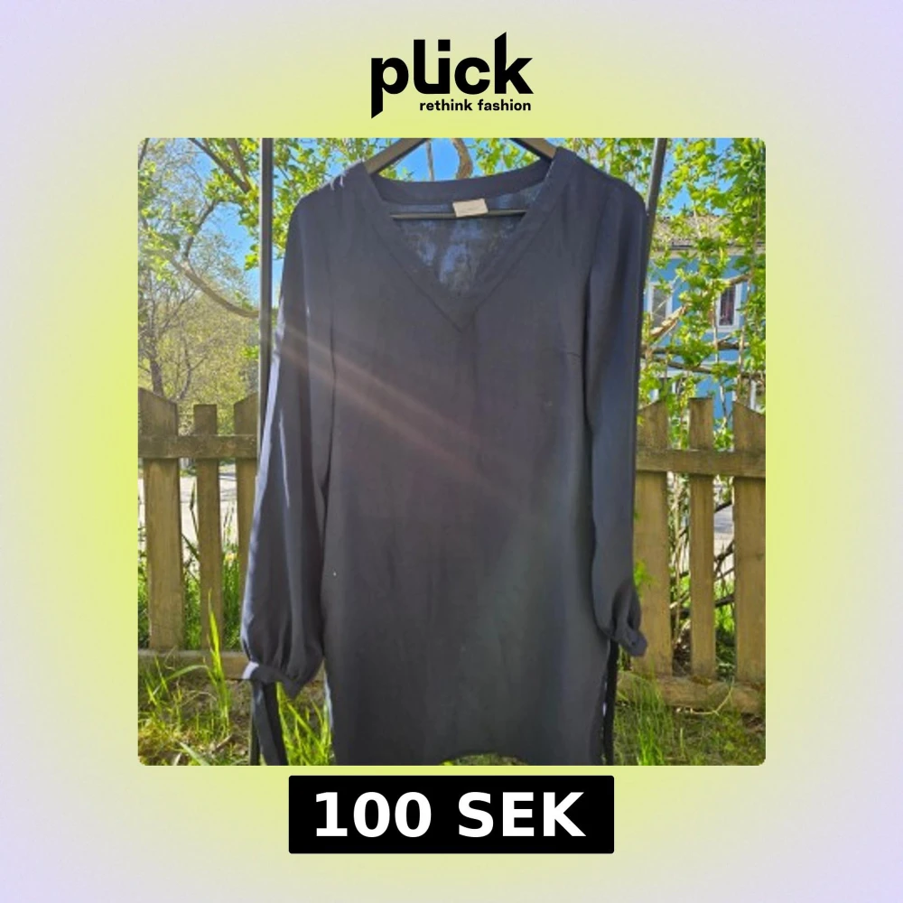 En stilren svart klänning med v-ringad hals och långa ärmar. Ärmarna har knytband vid handlederna för en extra detalj. Perfekt för dig som gillar enkel men snygg design. Genomskinligt tyg i ärmarna.