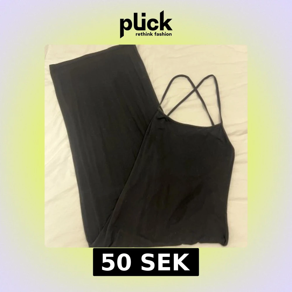 Svart långklänning från SHEIN med tunna axelband som korsas i ryggen. Klänningen har en enkel och stilren design med figurnära passform och ärmlös modell. Perfekt för dig som gillar minimalistisk stil och vill ha något bekvämt men snyggt.