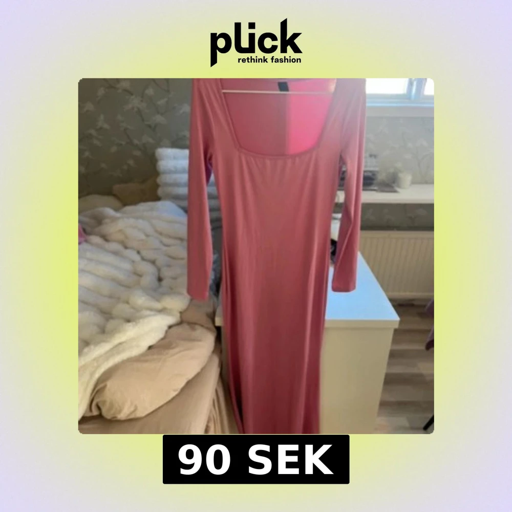 Säljer en elegant rosa långklänning med långa ärmar och en fyrkantig urringning. Perfekt för en stilren look. Klänningen har en mjuk och bekväm passform.