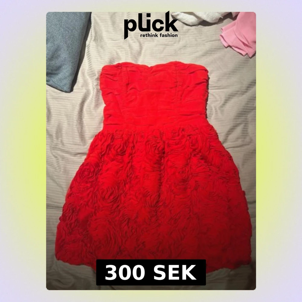 Säljer en röd axelbandslös kortklänning med volangdetaljer och rosformade texturer på kjolen. Klänningen har en figurnära passform upptill och en fluffig kjol som ger en festlig look. Perfekt för bal eller student. Materialet känns mjukt och har struktur.