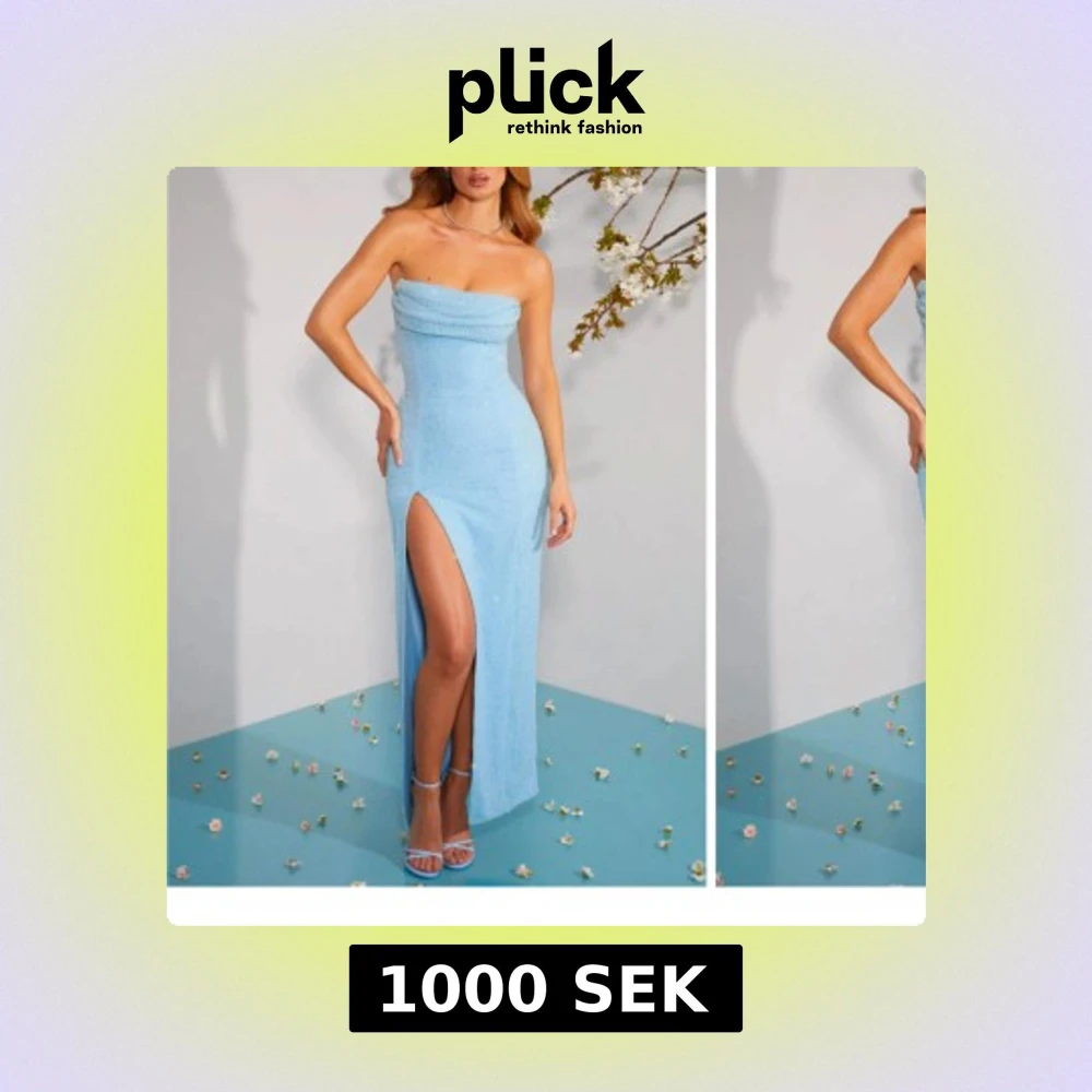 Supersnygg ljusblå långklänning med axelbandslös design och hög slits på ena sidan. Klänningen har en figurnära passform och ett glittrigt tyg som fångar ljuset. Perfekt för dig som vill sticka ut med en elegant och modern look.