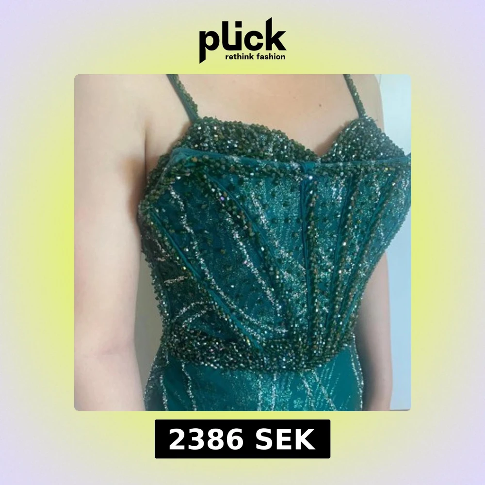 Magisk långklänning i djupgrönt med glittriga detaljer och pärlbroderier. Klänningen har smala axelband, figurnära passform och snörning i ryggen. Materialet är glittrigt och skimrande, perfekt för bal eller fest. Snyggt mönster som ger extra wow-effekt.
