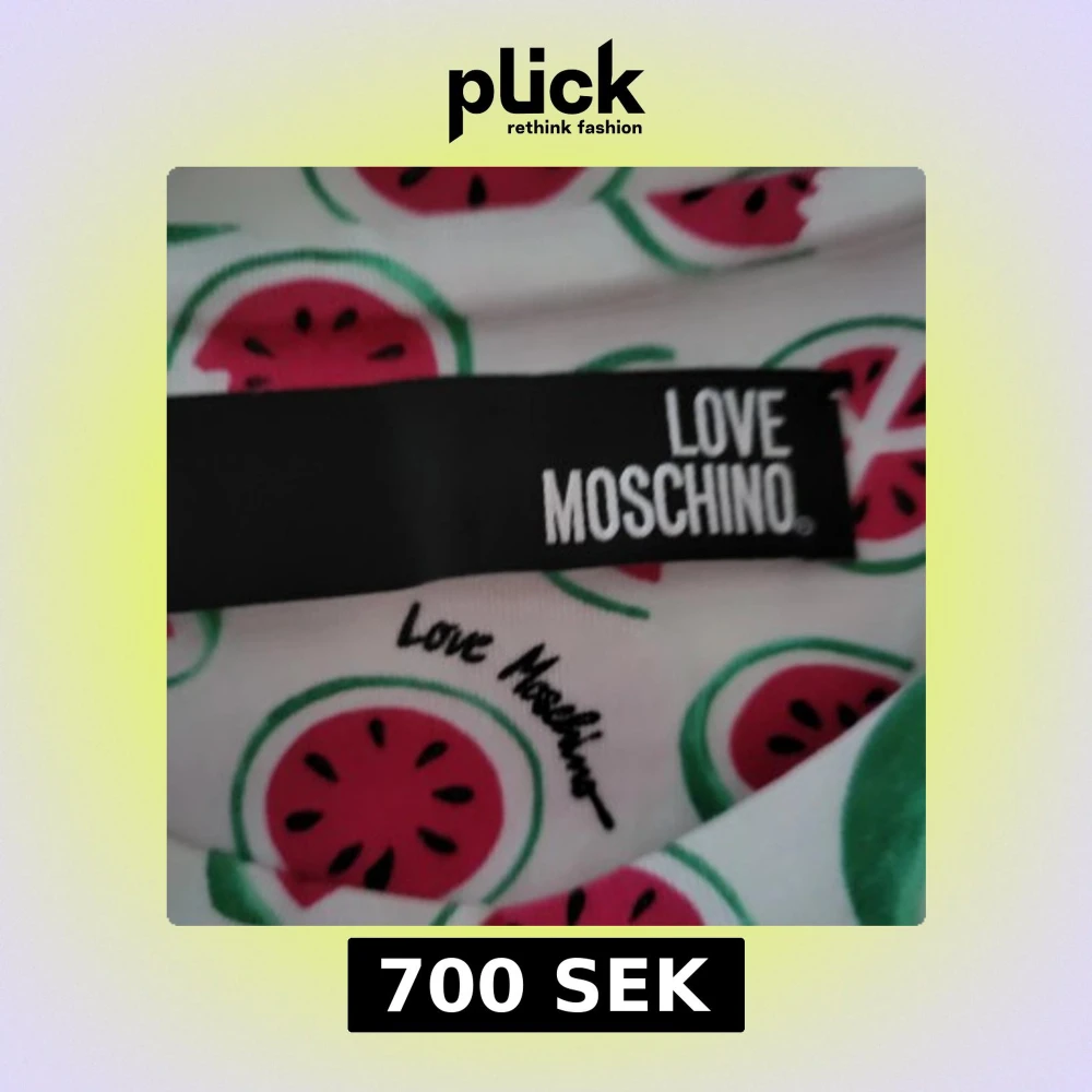 Säljer en vit klänning från Love Moschino med färgglatt vattenmelonmönster över hela plagget. Klänningen har rund hals och korta ärmar, och är gjord i mjuk bomull. Perfekt för dig som gillar lekfulla prints och vill sticka ut med en unik design.
