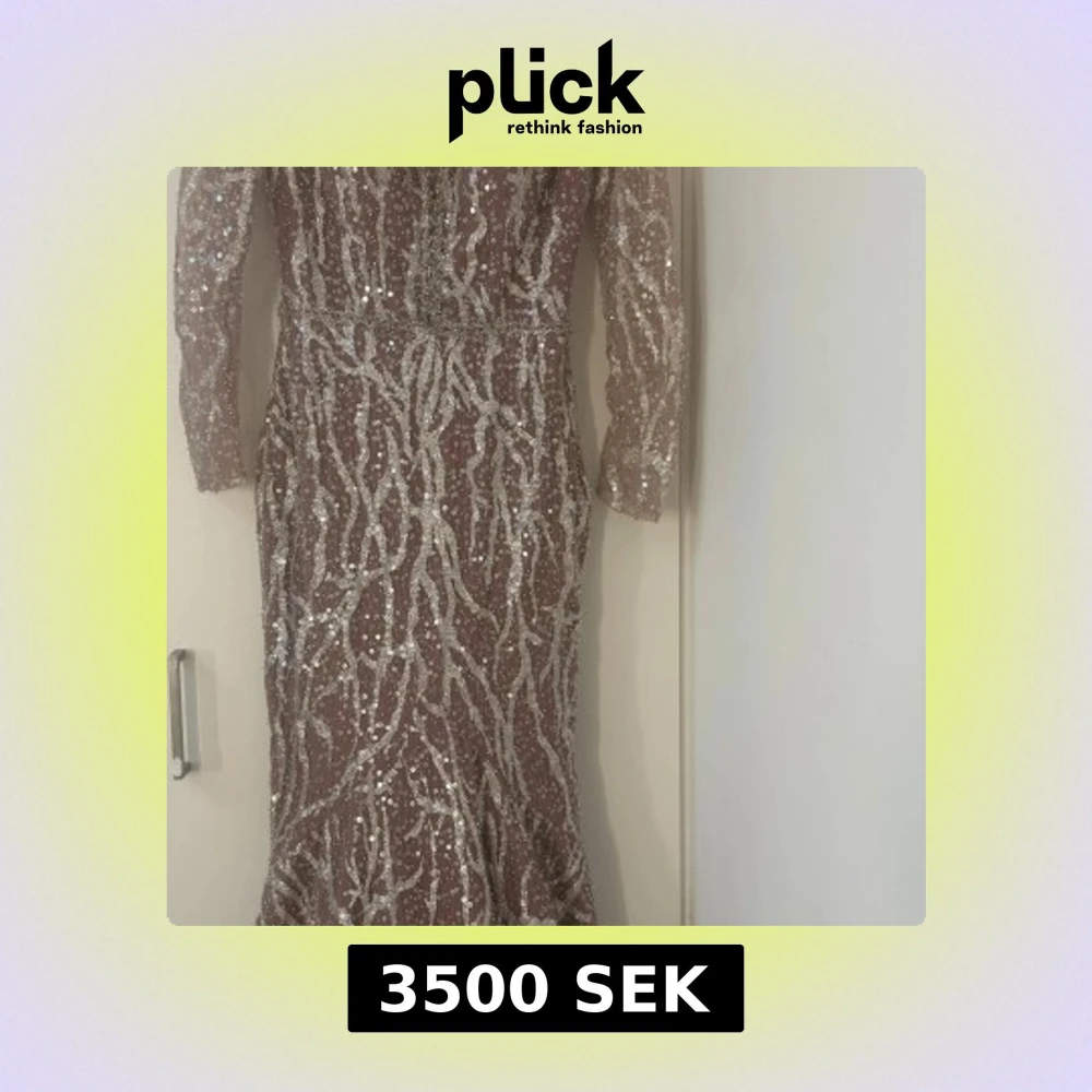 Supersnygg långklänning i beige med silverfärgade paljetter och glittrigt mönster. Klänningen har lång ärm, figurnära passform och v-ringning i ryggen. Perfekt för dig som vill sticka ut med en glamorös look.
