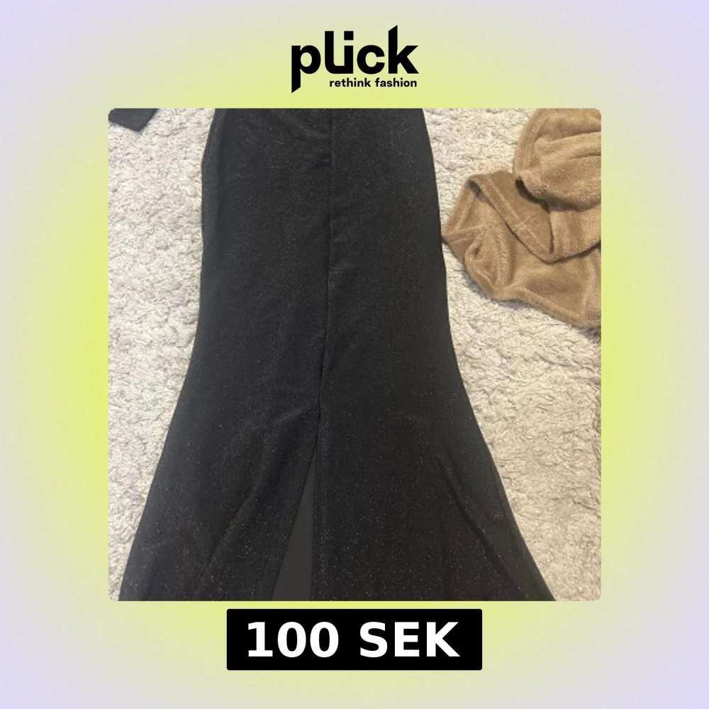 Säljer en svart långklänning med glittrigt tyg och v-ringning. Klänningen har lång ärm och en snygg slits framtill. Perfekt för festliga tillfällen och har en elegant passform. Aldrig använt.