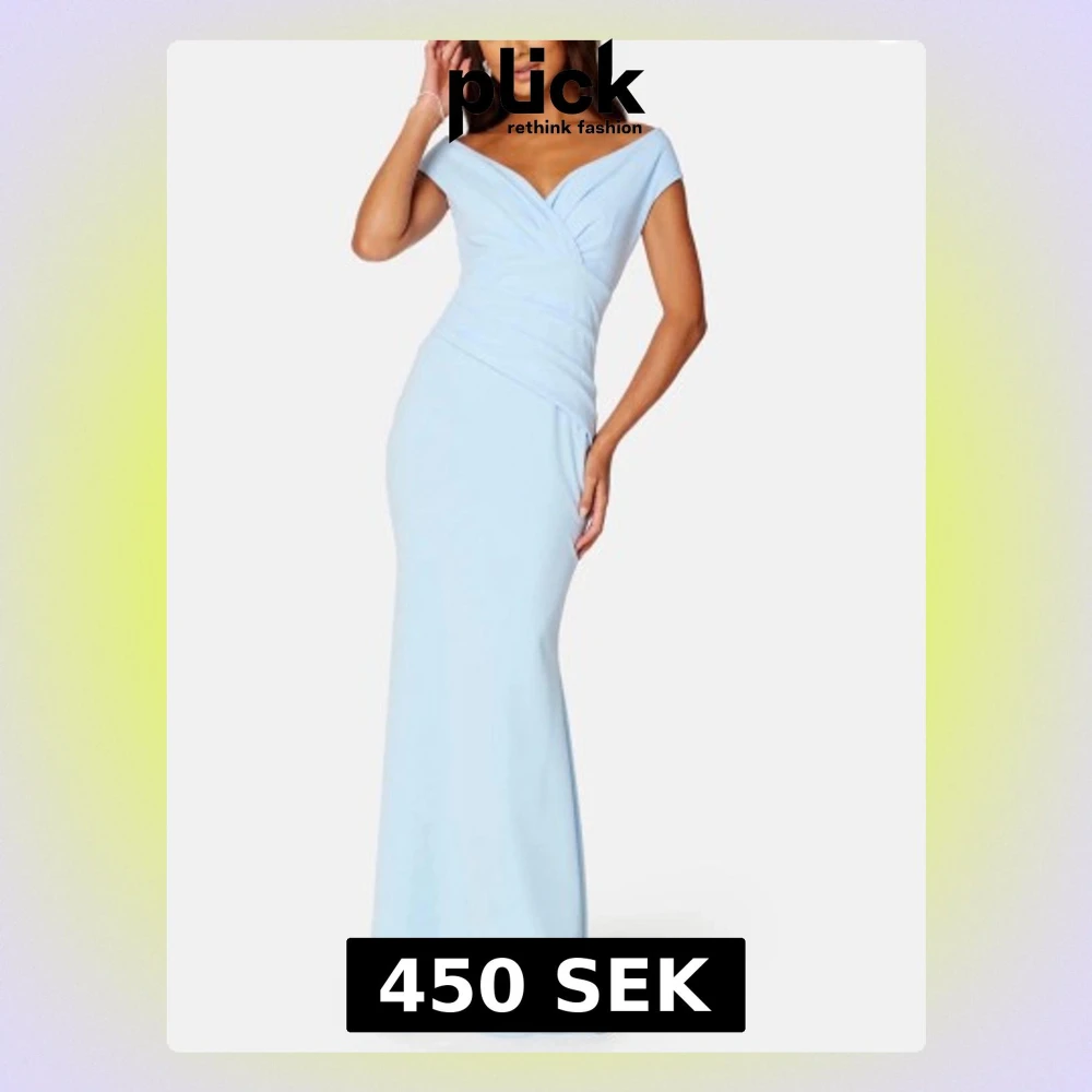 Elegant ljusblå långklänning med off shoulder-skärning och draperad överdel. Klänningen har figurnära passform och lätt utsvängd kjol. Perfekt för bal eller speciella tillfällen. Materialet är mjukt och följsamt. Är som ny, ändrat använd vid ett tillfälle. Storlek S Ny pris: 999kr Säljs för: 500kr