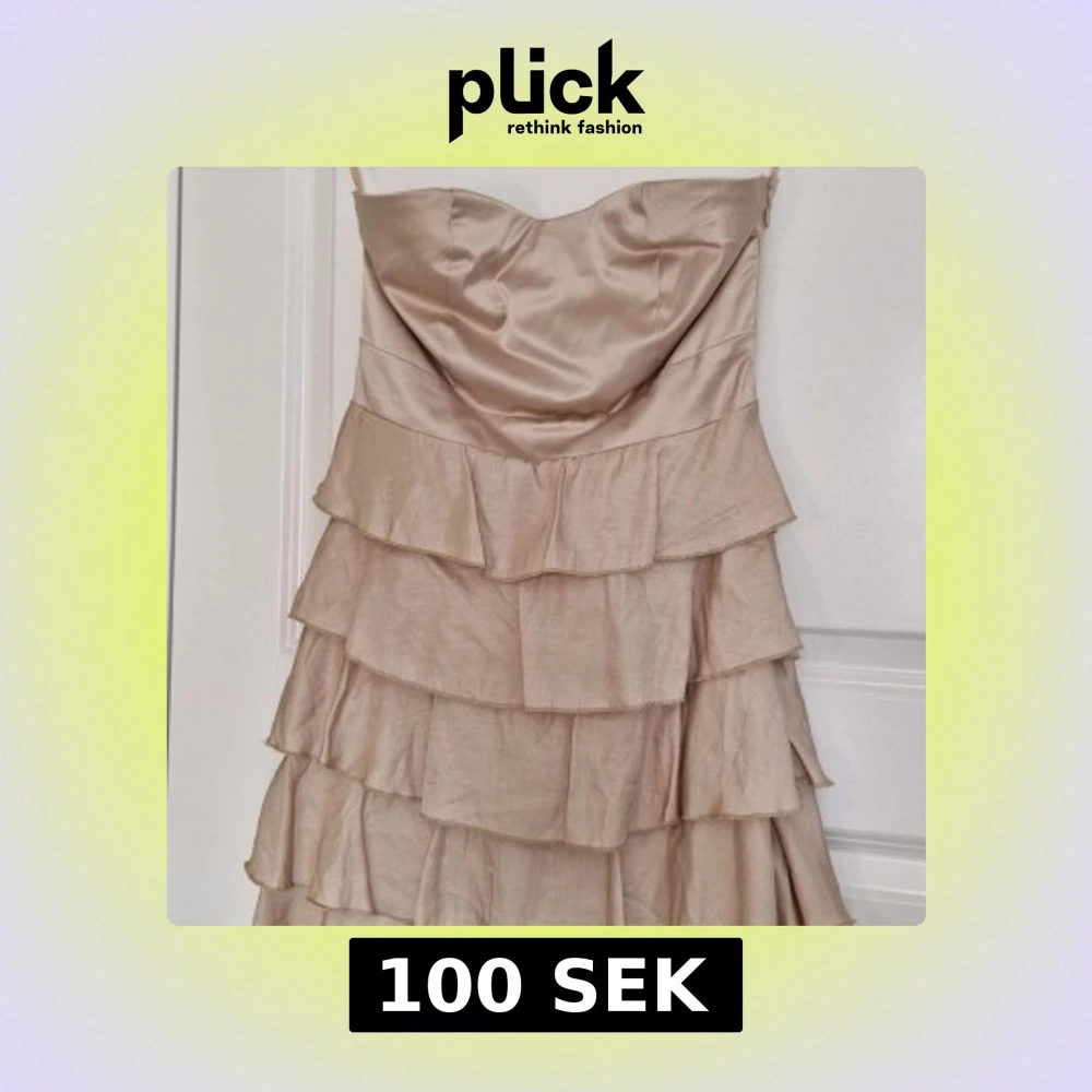 Champagnefärgad kortklänning från Amisu med flera lager volanger. Klänningen har en snygg omlottkänsla upptill och dragkedja i sidan. Perfekt för dig som vill sticka ut med en feminin och trendig look. Köpt för ca 300kr säljer för 100kr🩷 den är i använt skick men har inga defekter.