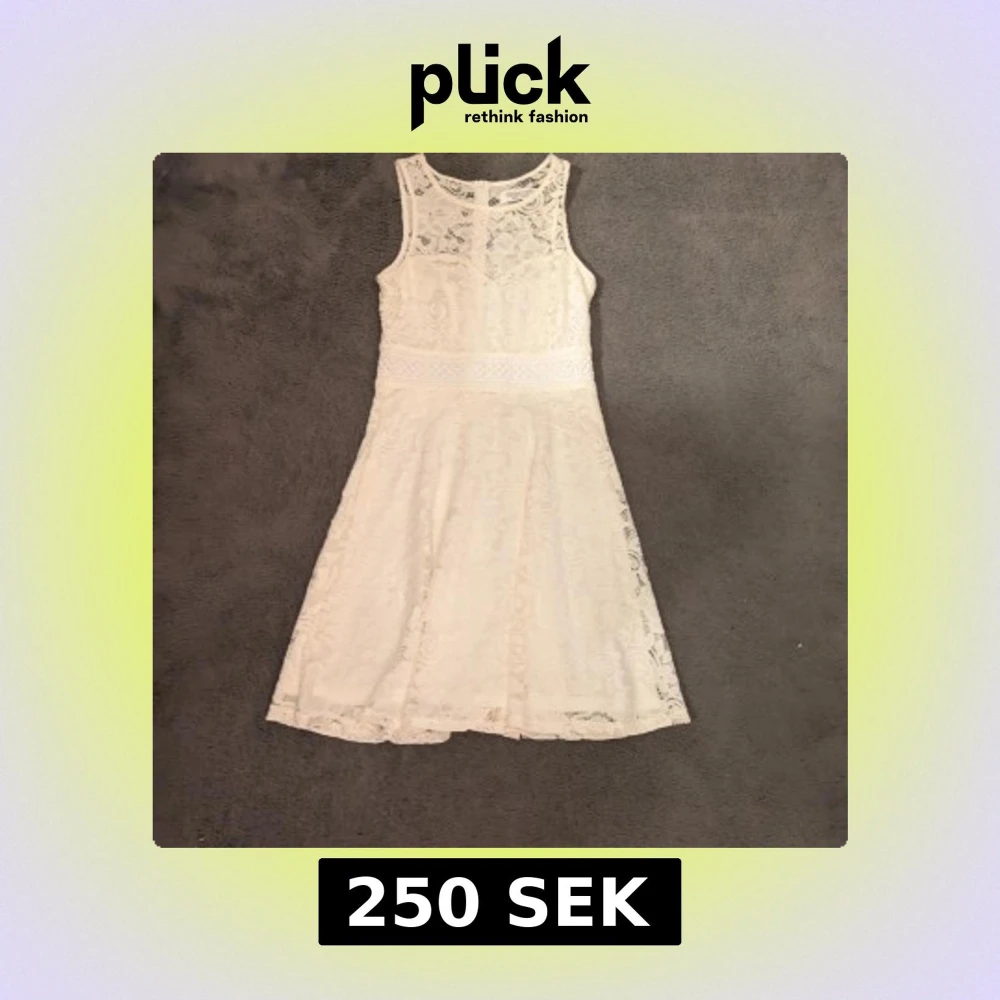 Superfin vit klänning i spets med ärmlös modell och rund halsringning. Klänningen har markerad midja och lätt utställd kjol.