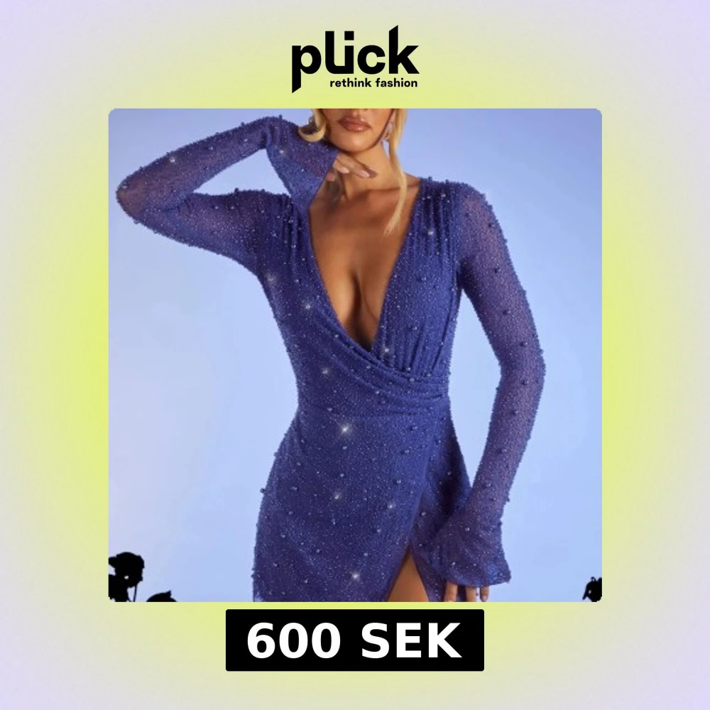 Säljer en blå kortklänning med lång ärm och djup v-ringning. Klänningen har omlott-design, glittriga detaljer och en liten slits framtill. Perfekt för dig som vill sticka ut med en festlig look.